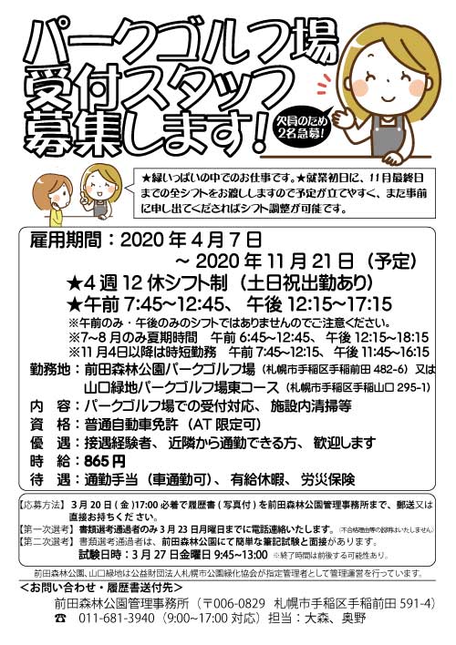 令和2年3月20日金曜日 17時必着で履歴書(写真付)を郵送又は直接お持ちください。※備考欄等に「前田森林パークゴルフ受付希望」又は「山口緑地パークゴルフ受付希望」と必ず記載してください。どちらでもよい方は、「パークゴルフ場受付希望」のみご記載ください。