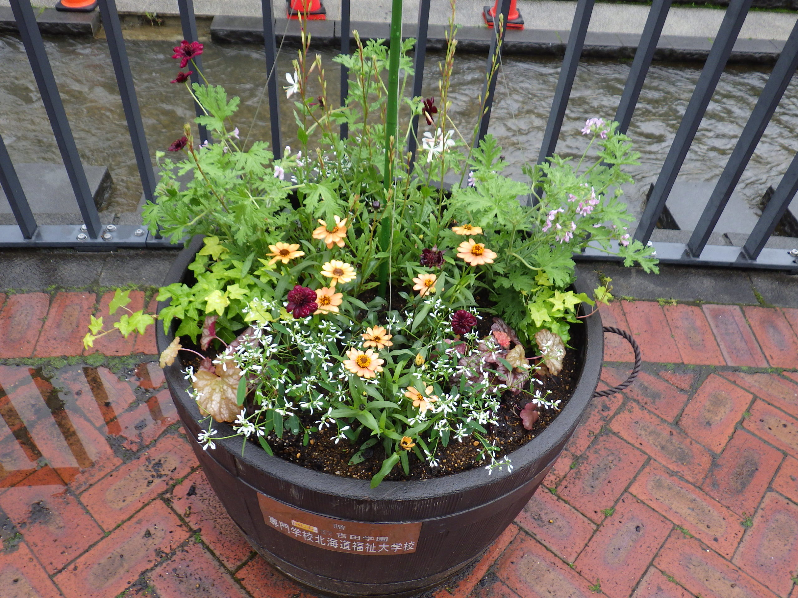 5月27日に植え込んだ吉田学園からの寄付の樽型コンテナの花