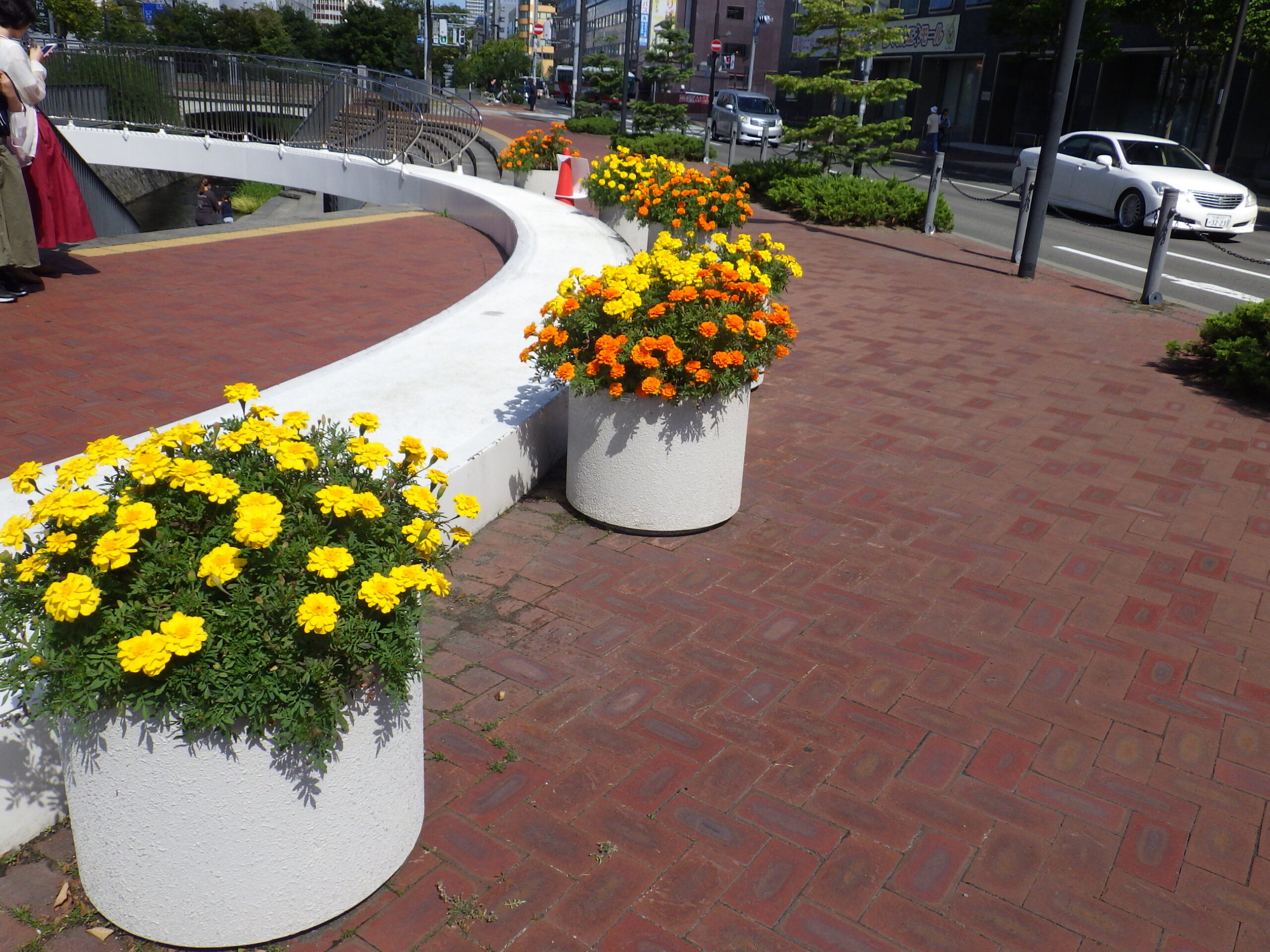 大通ブロックスノーリング横のコンテナに植えているマリーゴールドの様子