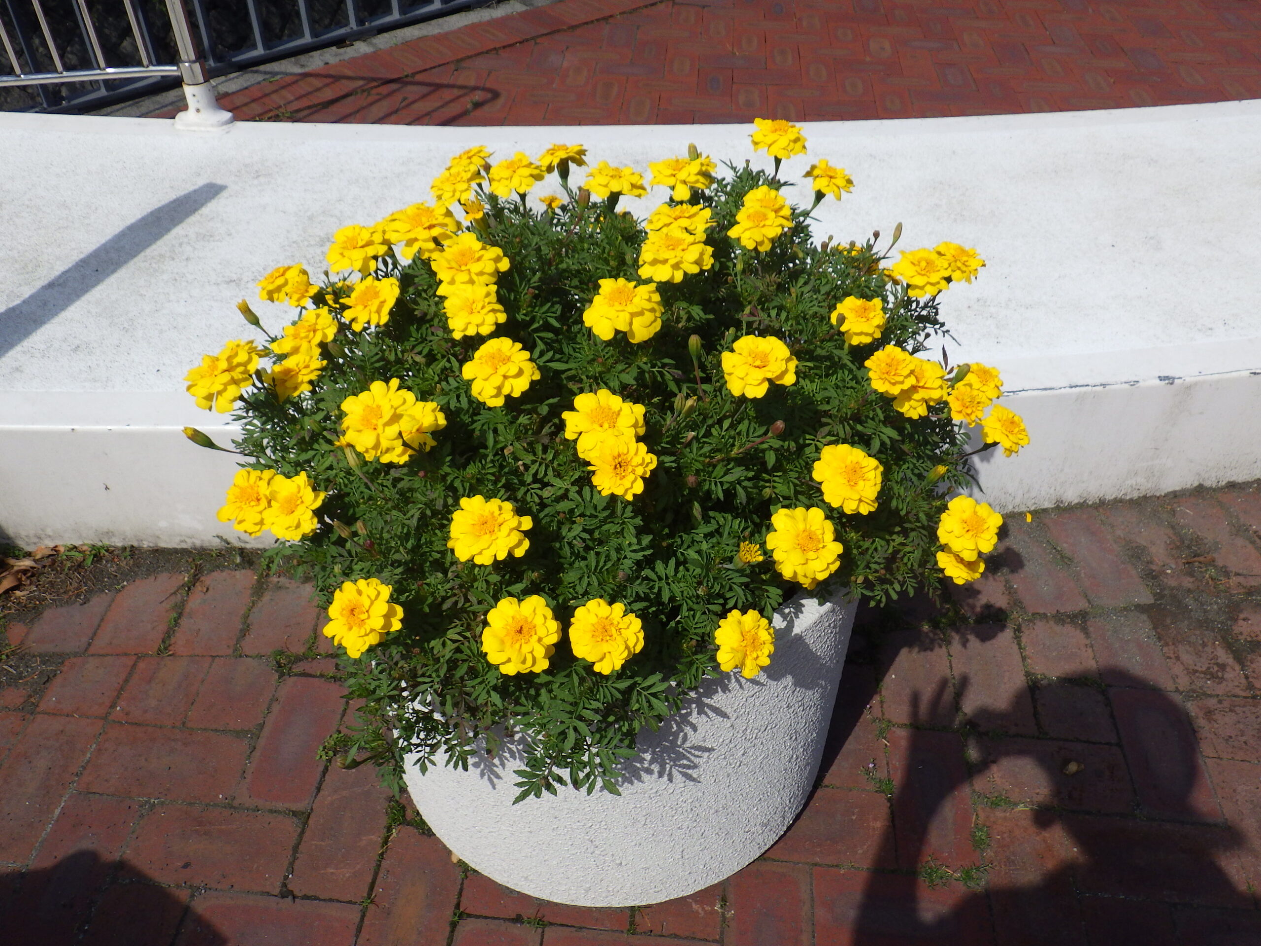 大通ブロックスノーリング横のコンテナに植えている黄色のマリーゴールドの様子