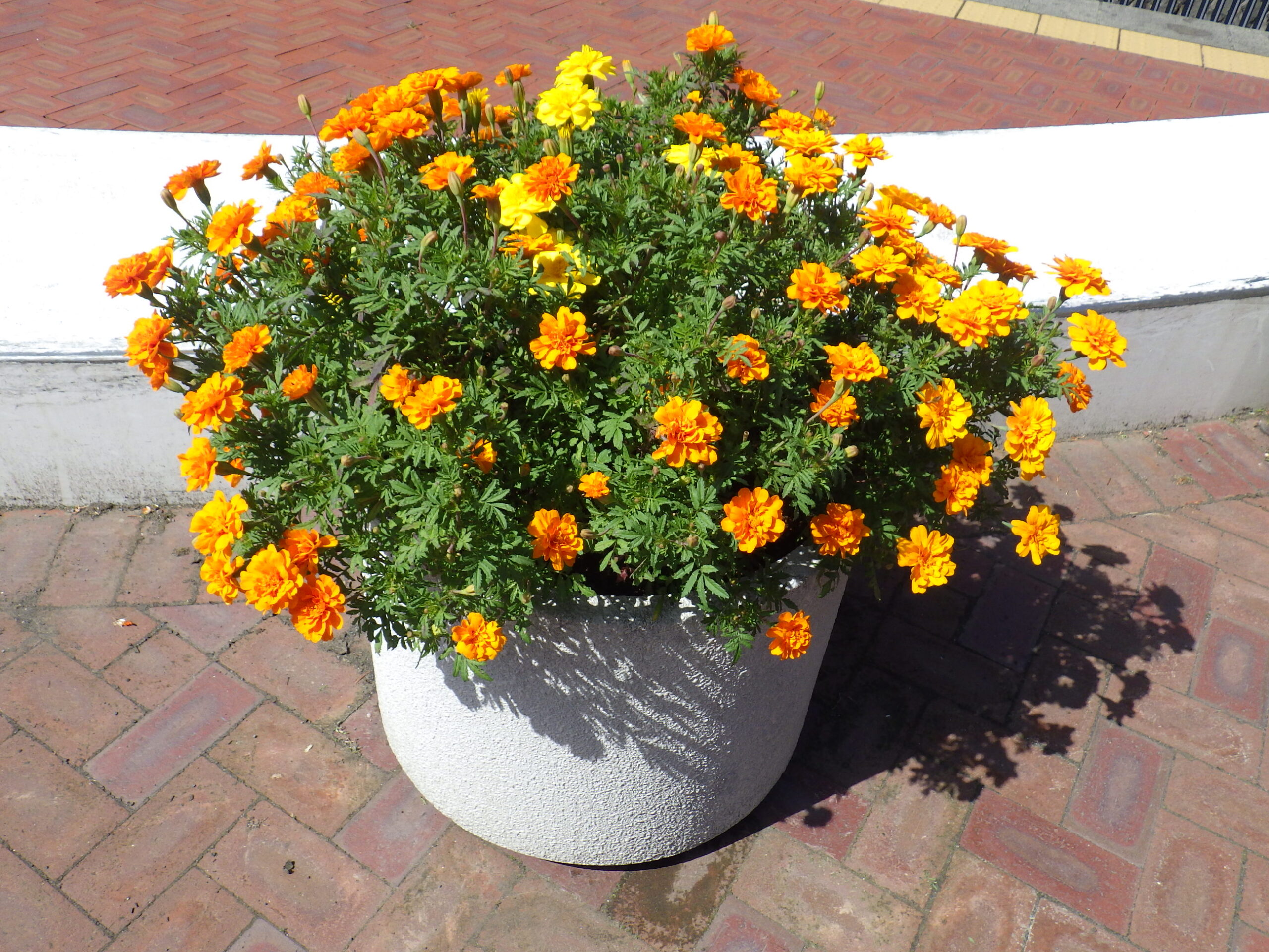 大通ブロックスノーリング横のコンテナに植えているオレンジのまmン中に黄色のマリーゴールドの様子