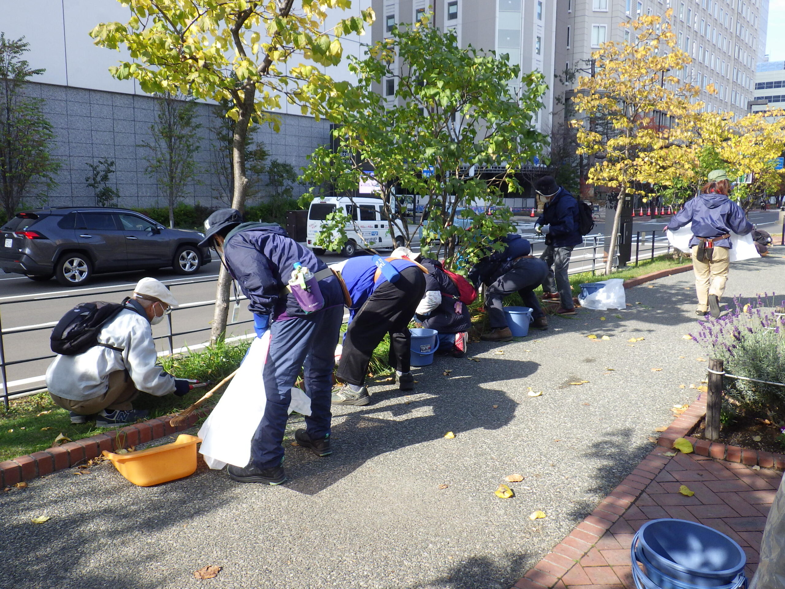 10月26日に北2条でヘメロカリスの刈り取りをする植物ボランティア