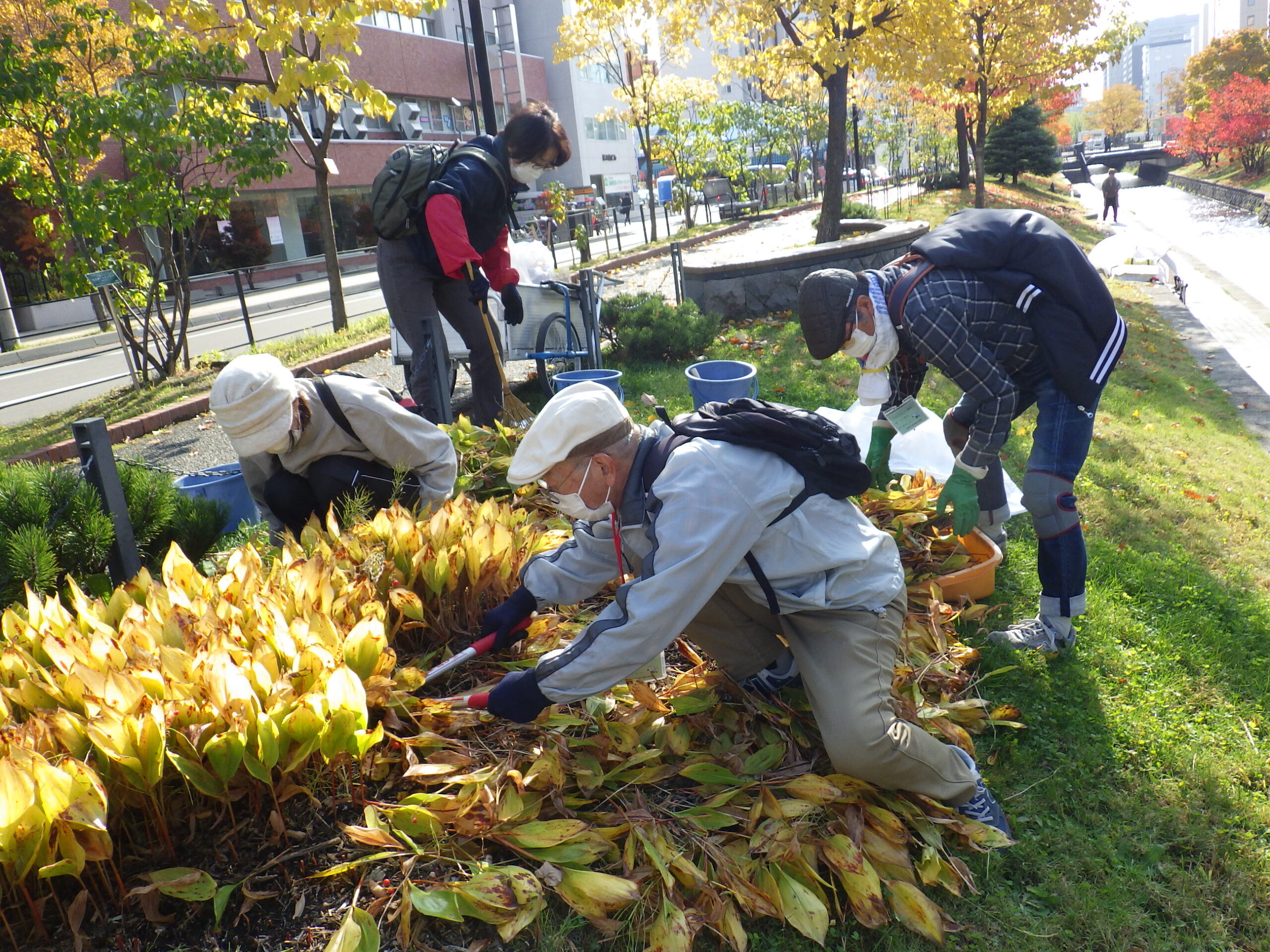 10月27日に南2条でスズランの刈り取りをするお助け隊