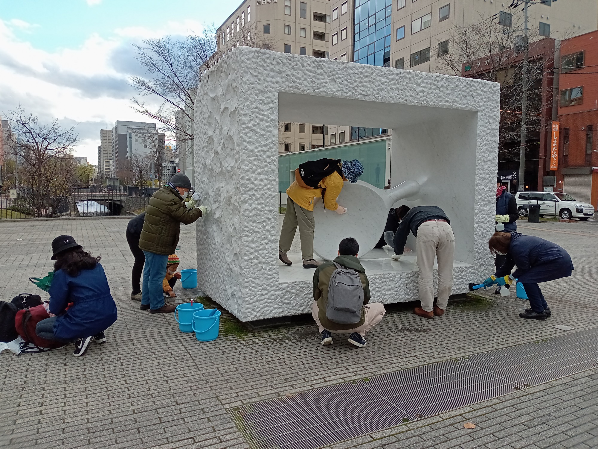 11月13日に生誕の清掃をする彫刻清掃ボランティア創成川ポポロのメンバー