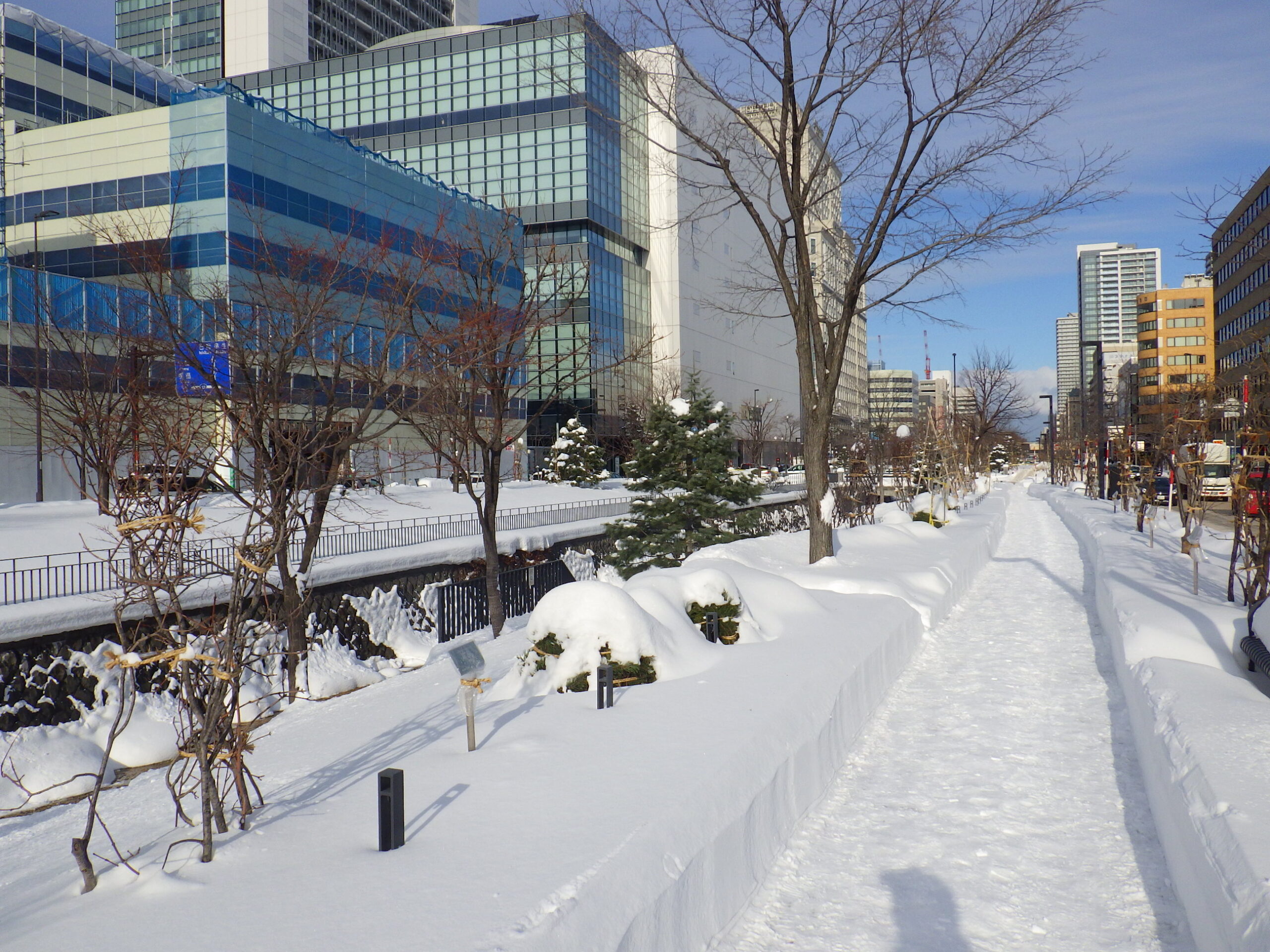 片側除雪された北1条東側の様子