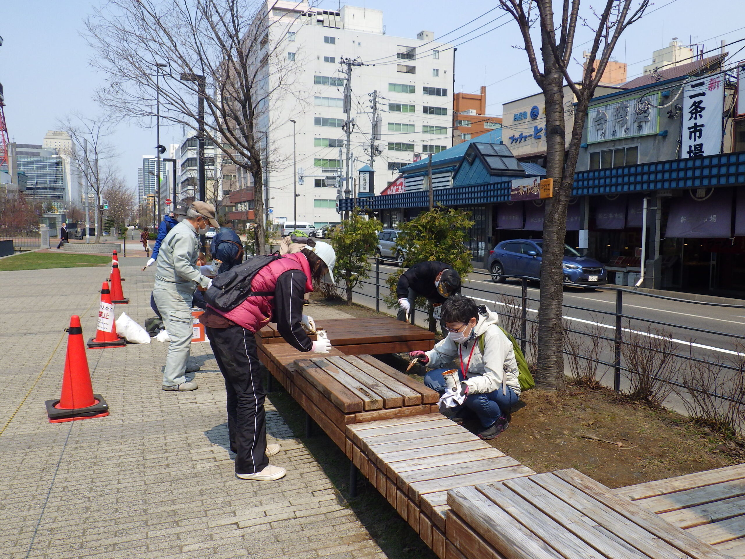 4月20日に狸二条広場のベンチの塗装をするお助け隊5