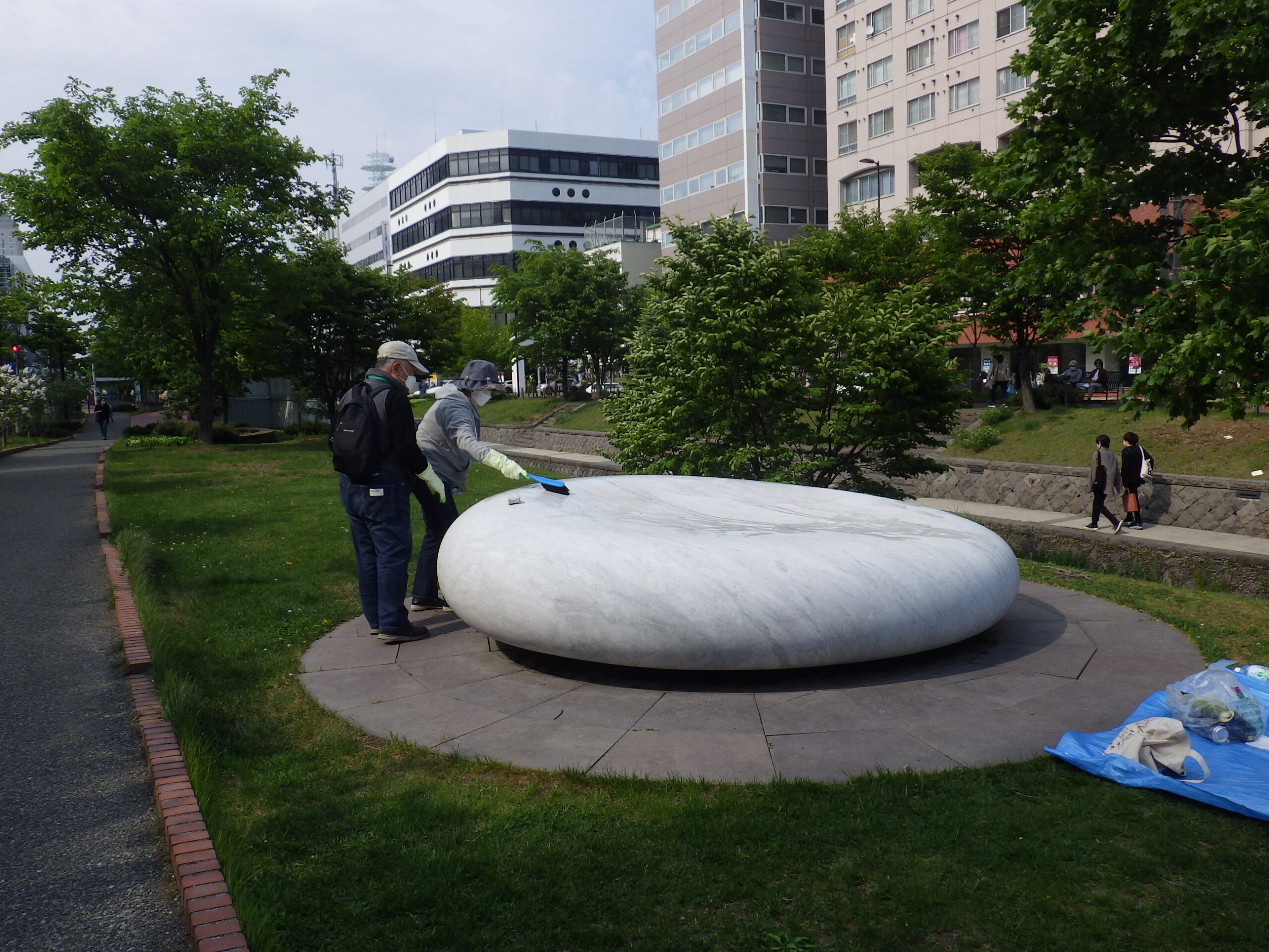 5月21日に安田侃彫刻作品「天秘」を清掃するボランティアの皆さん
