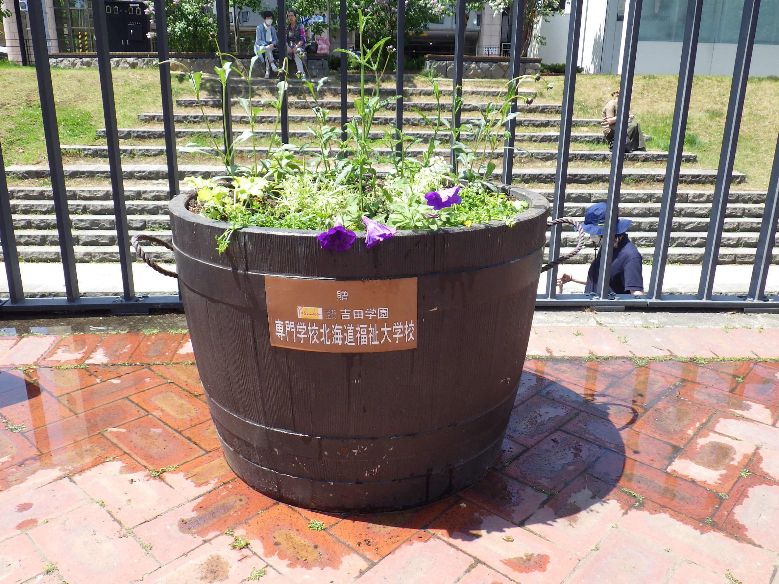 5月26日に花クラブメンバーが植え込みをした吉田学園さんからの寄付の樽コンテナの様子