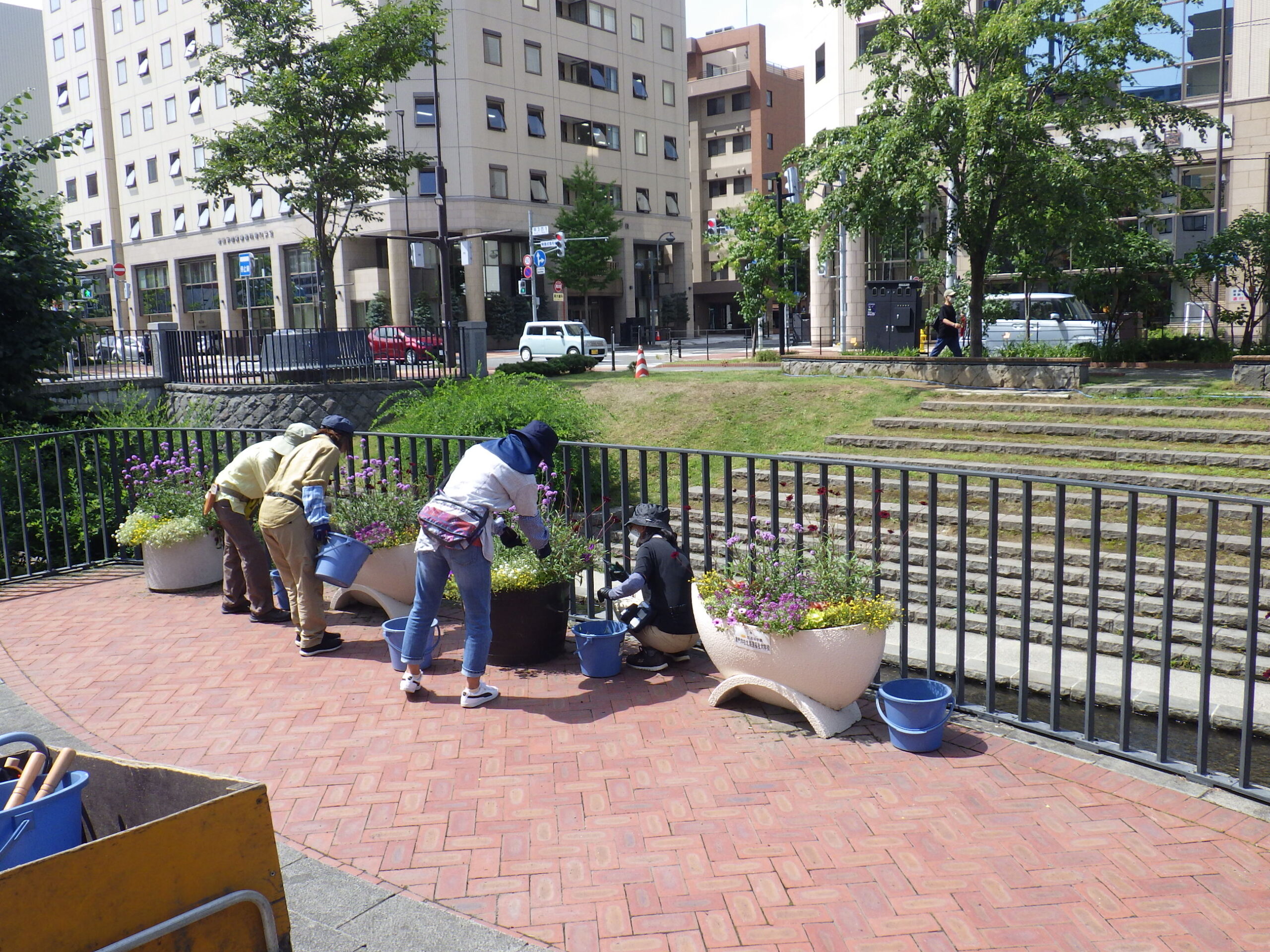 8月4日にコンテナ花壇の手入れの活動をする花くらぶ