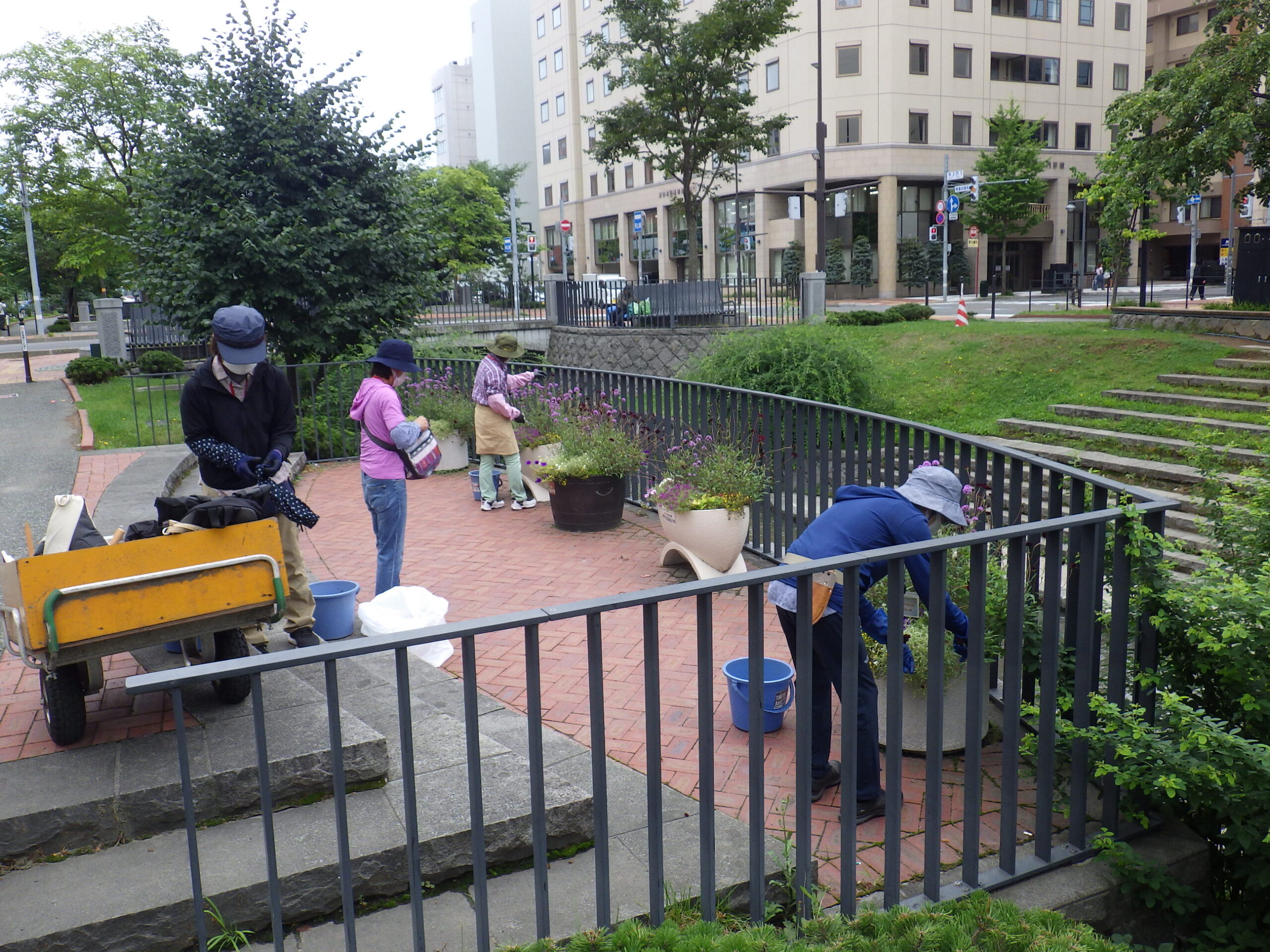 8月18日に狸二条広場のコンテナの手入れをする花くらぶ