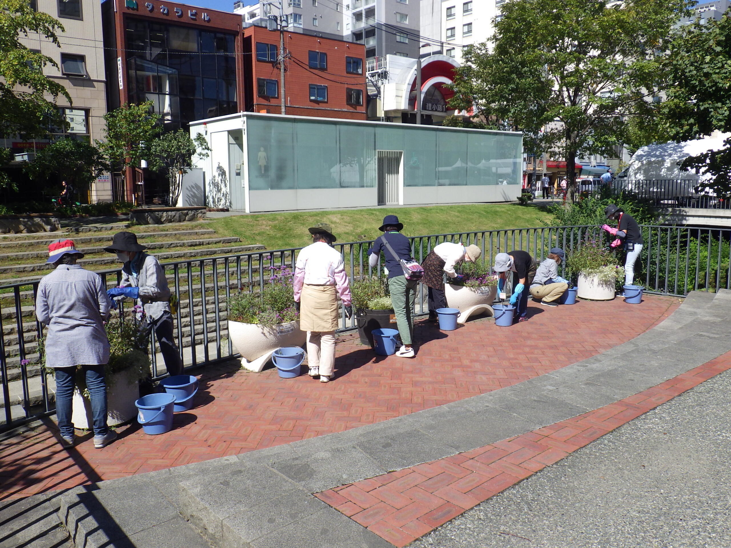 9月8日に狸二条コンテナの手入れをする花くらぶの様子