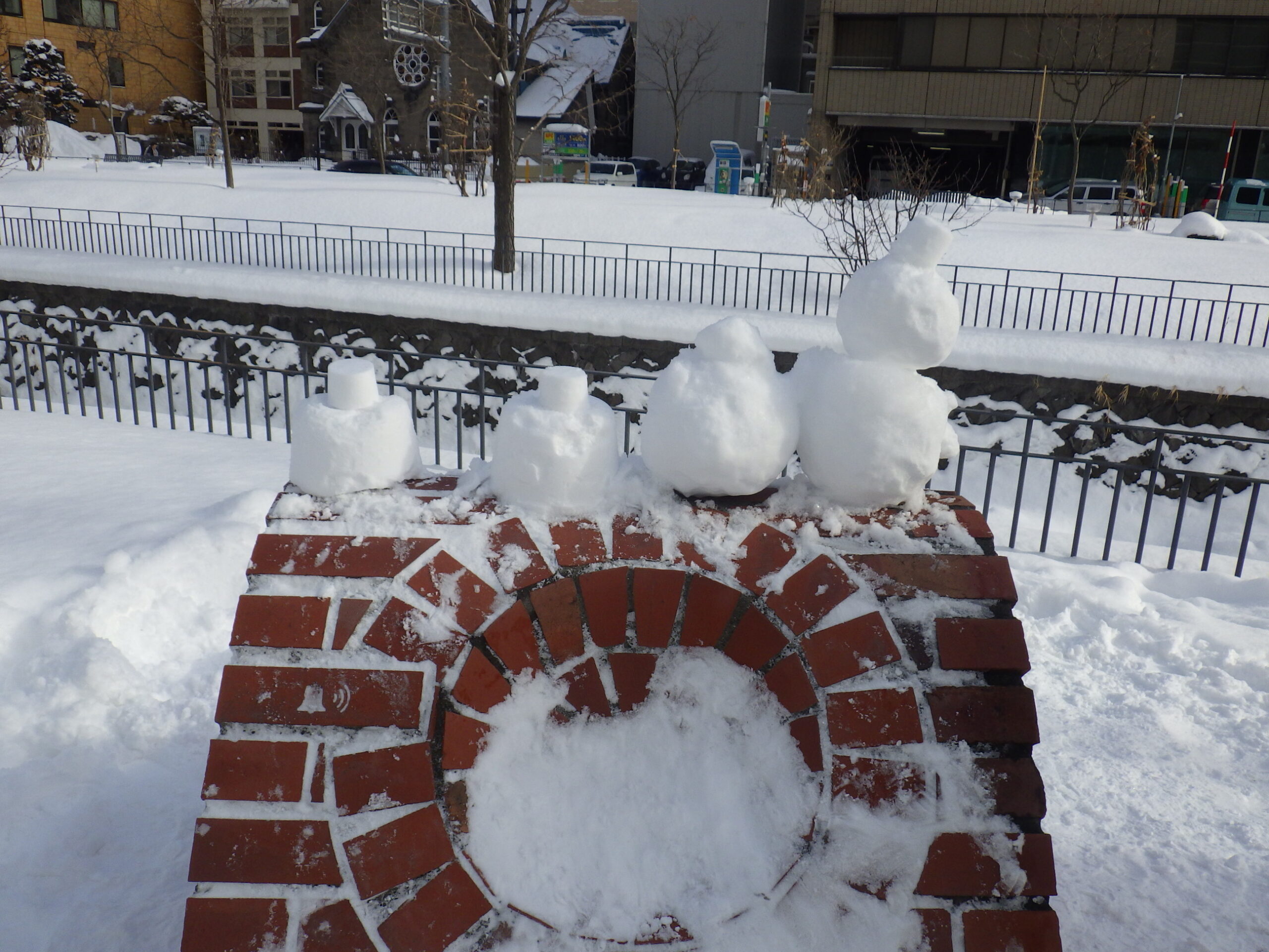 北2条のレンガの作品の上に載せられた雪だるまの画像