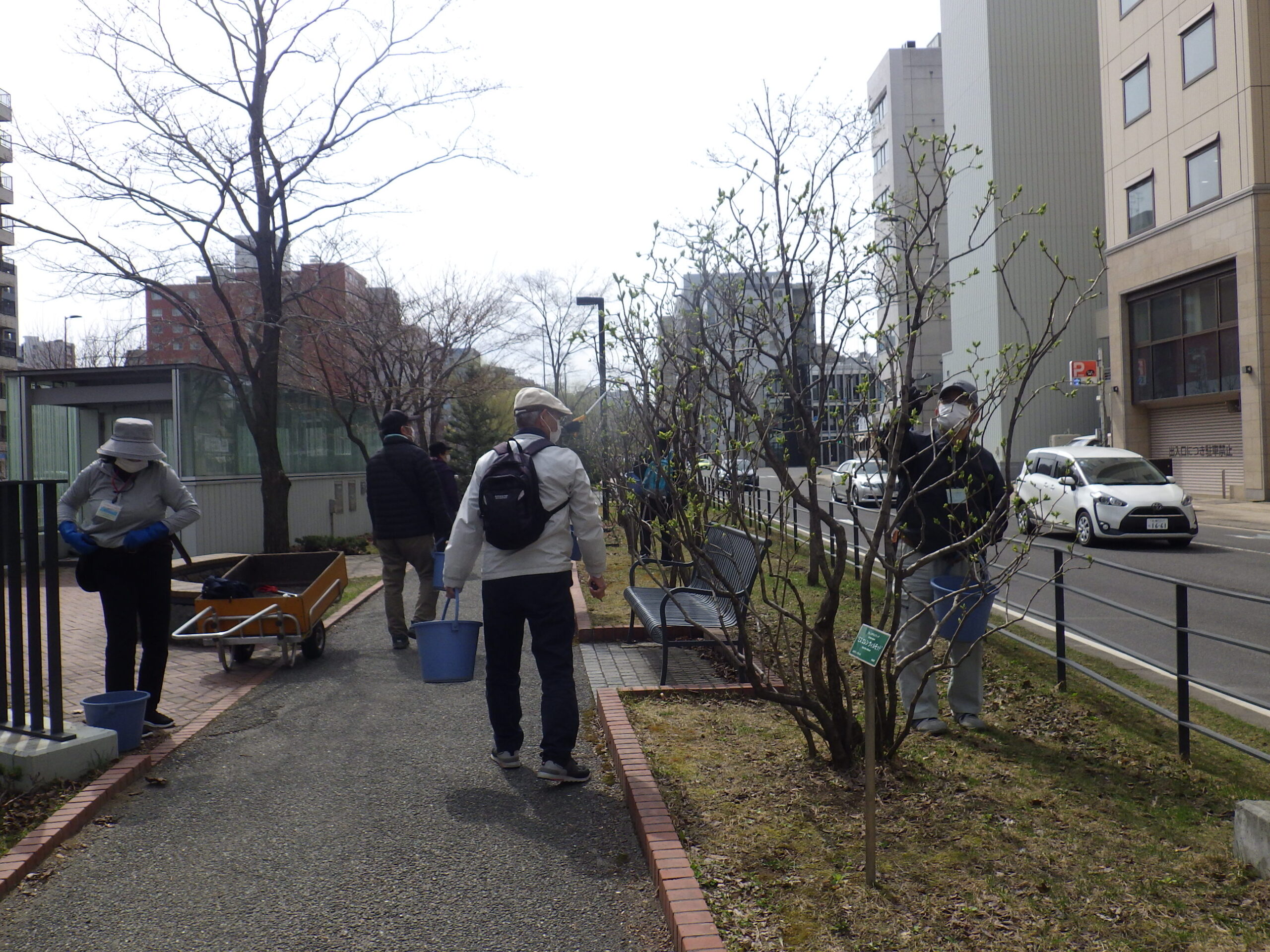 4月11日にライラックの枯れ枝の剪定をする植物ボランティア