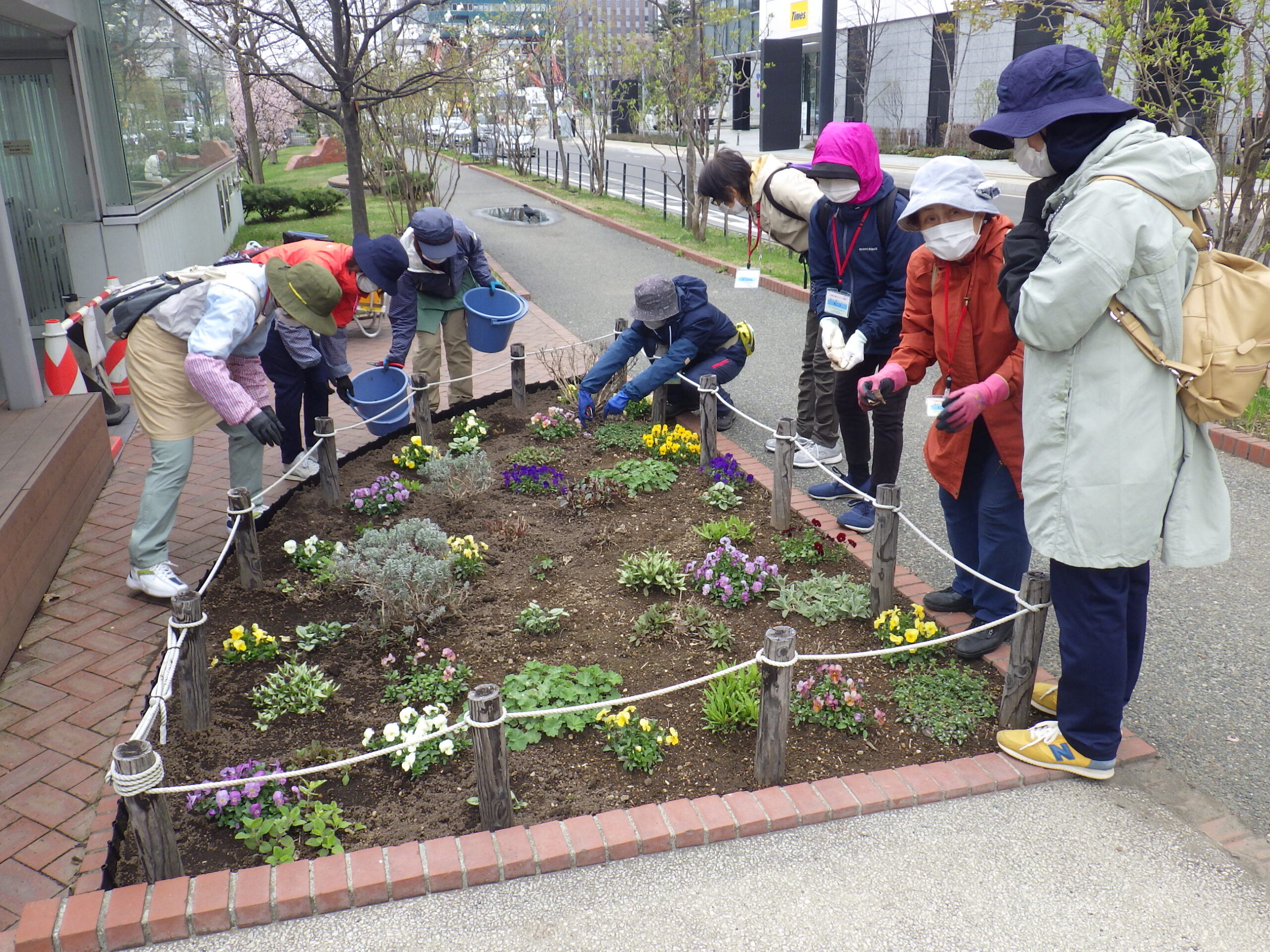 4月20日に花壇の手入れをする花くらぶ