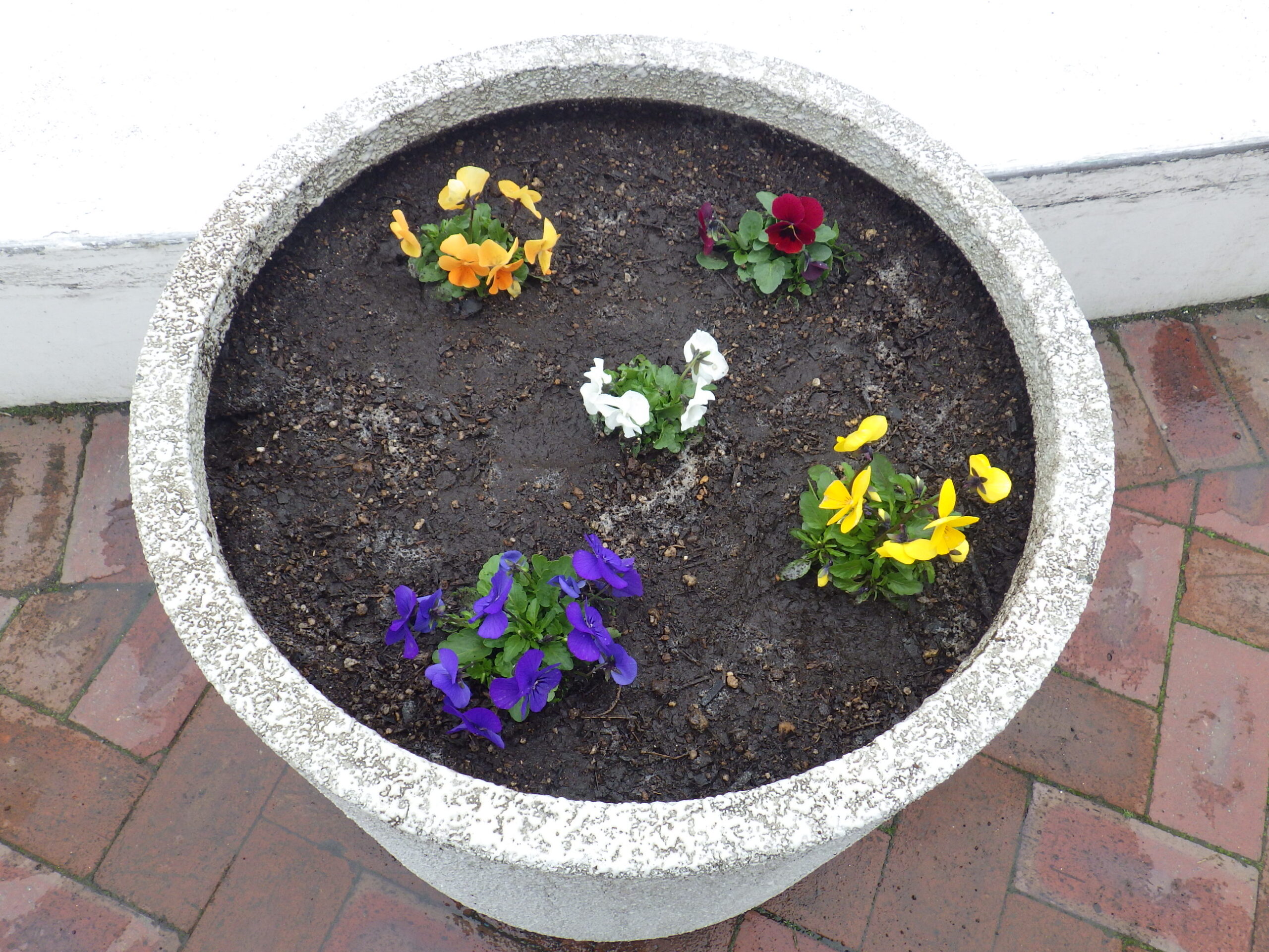 ミックスのビオラが植え込まれたまんなか広場のコンテナ