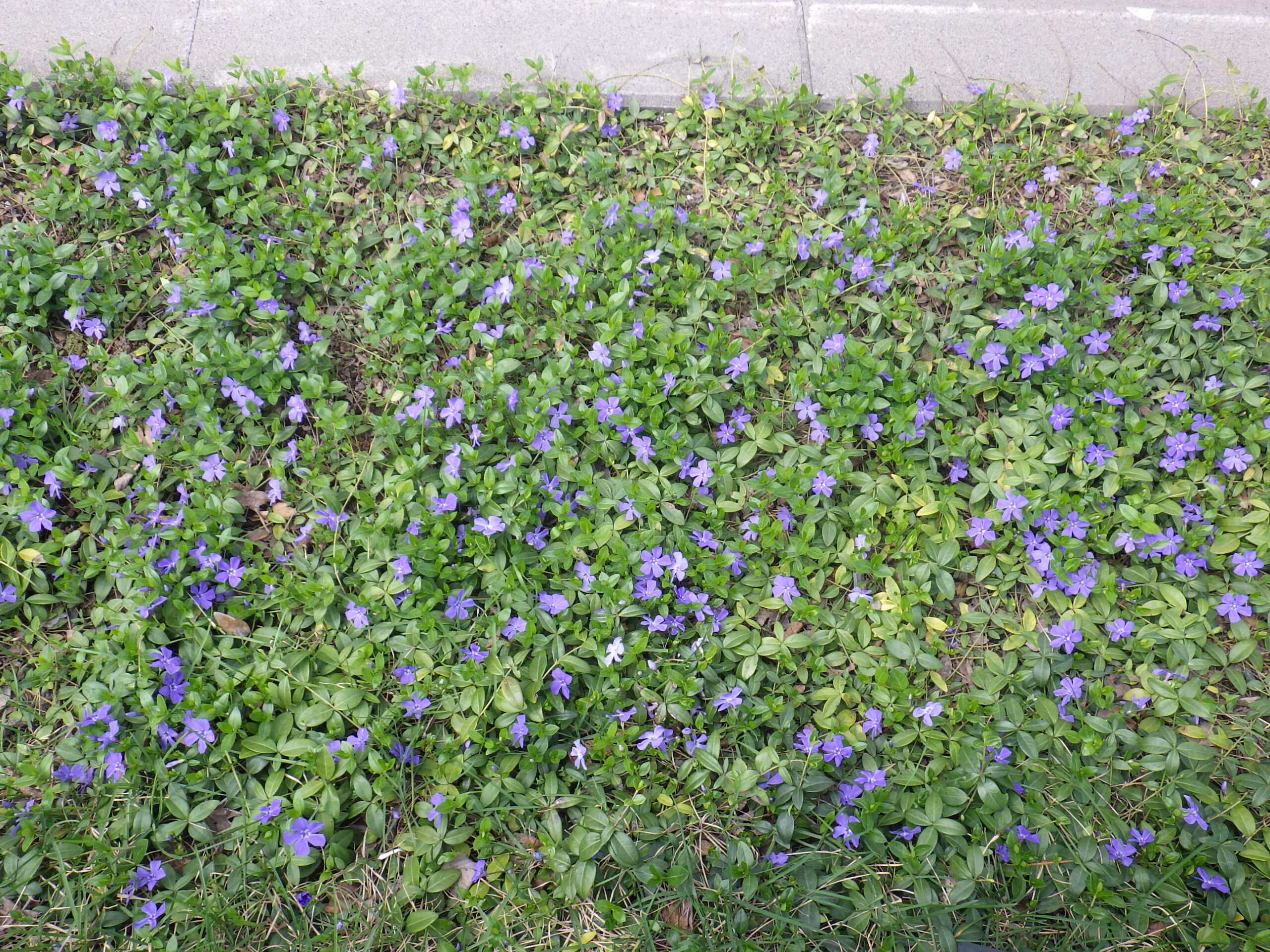 5月1日に道路側植栽地で咲いていたビンカミノールの花