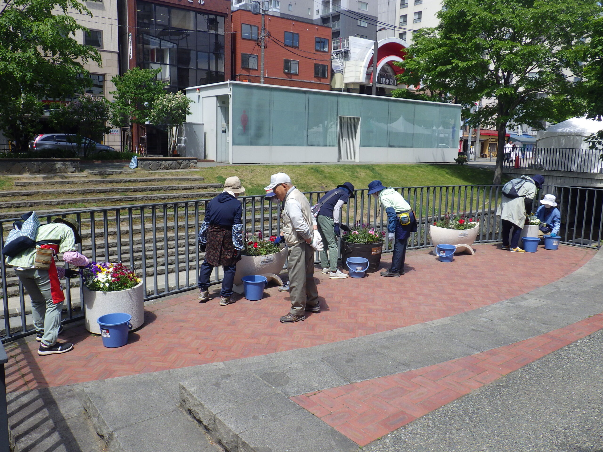 6月1日に狸二条コンテナ花壇のお手入れをする花くらぶ