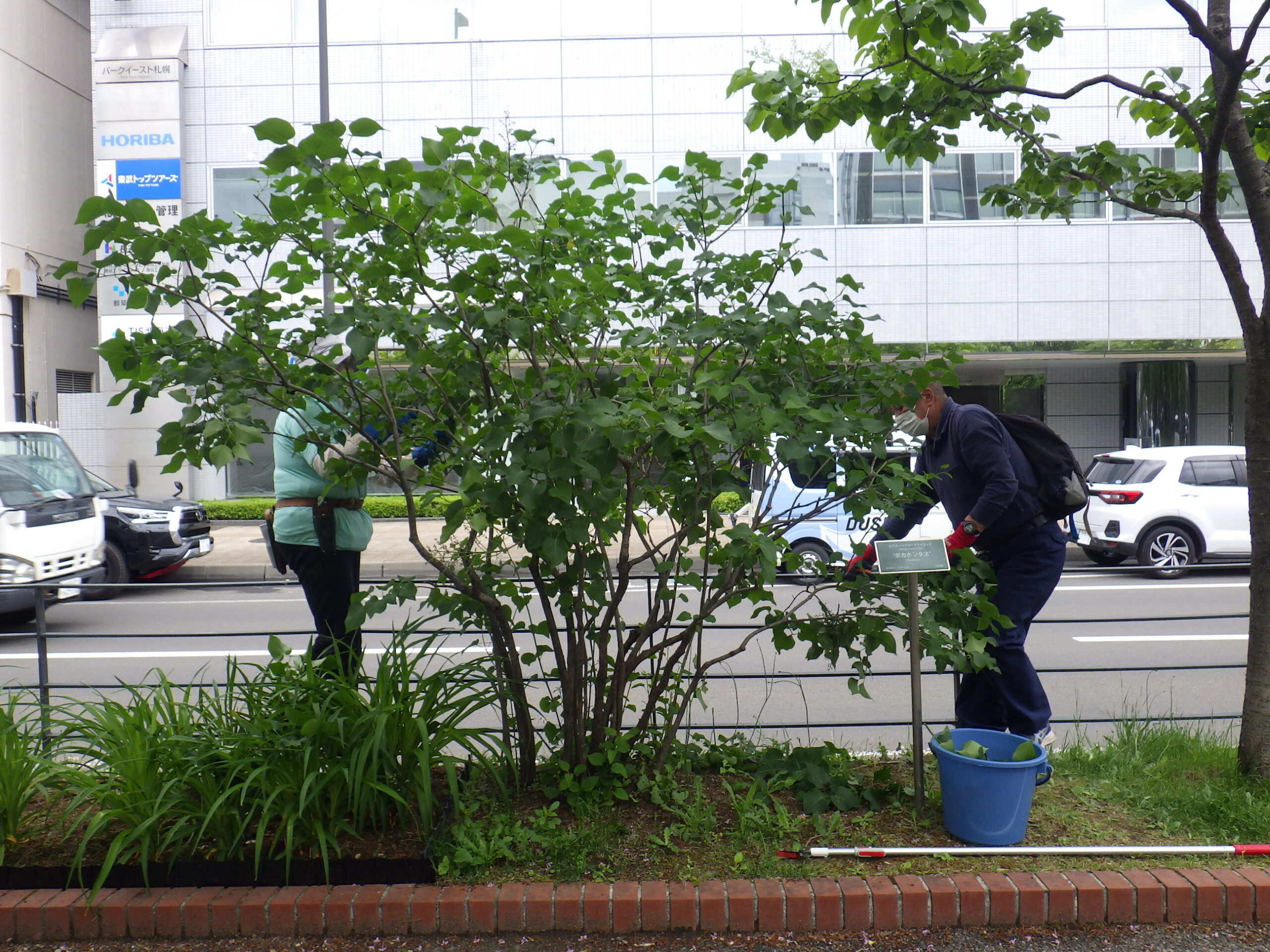 6月6日にライラックの花がら摘みと花後剪定をする植物ボランティア