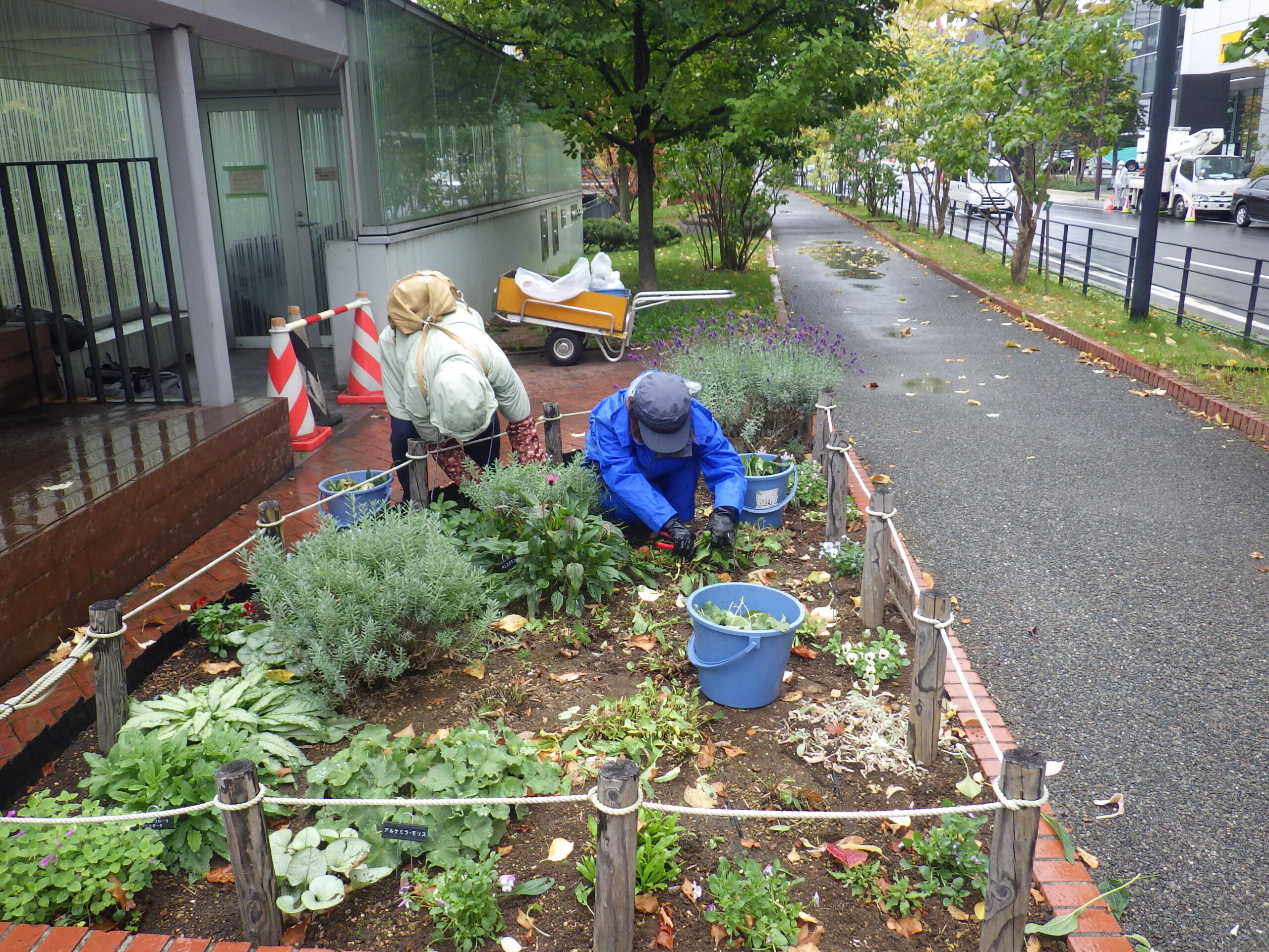 10月19日に花壇の宿根草の刈り込みをする花くらぶ