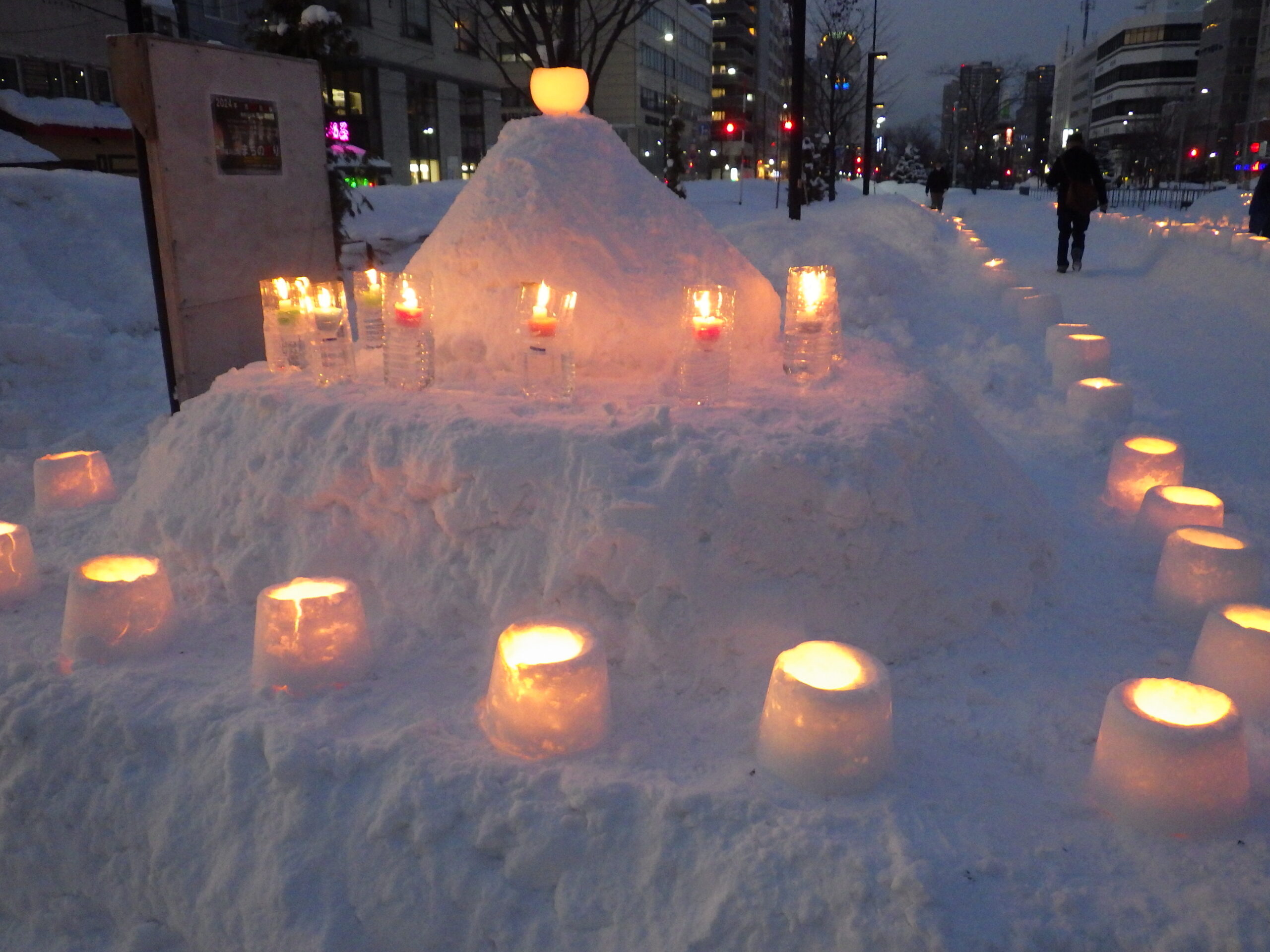 1月20日の創成川公園まちの灯りで、灯りがともった狸二条広場の様子