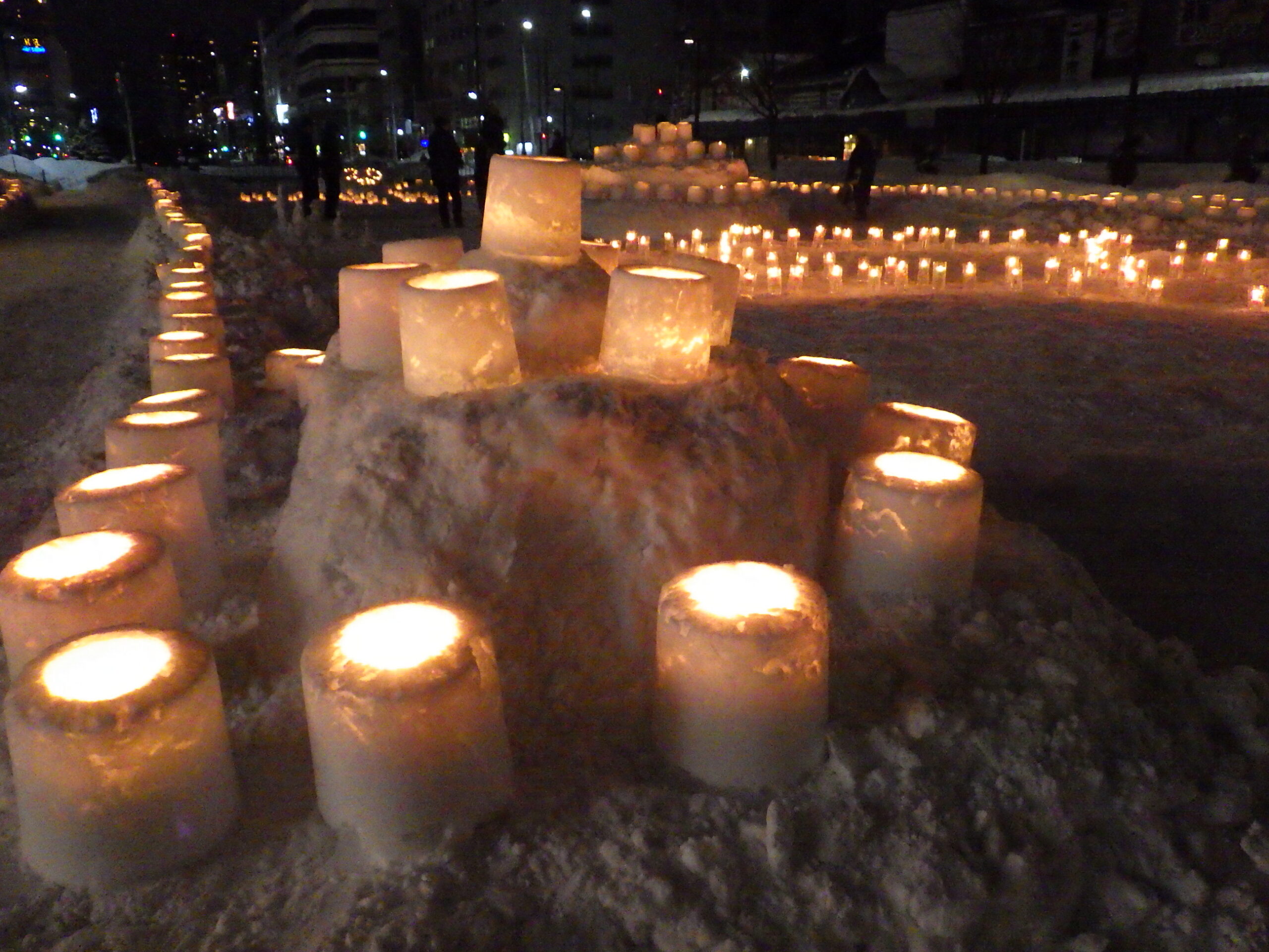 1月20日の創成川公園まちの灯りで、灯りがともった狸二条広場の様子