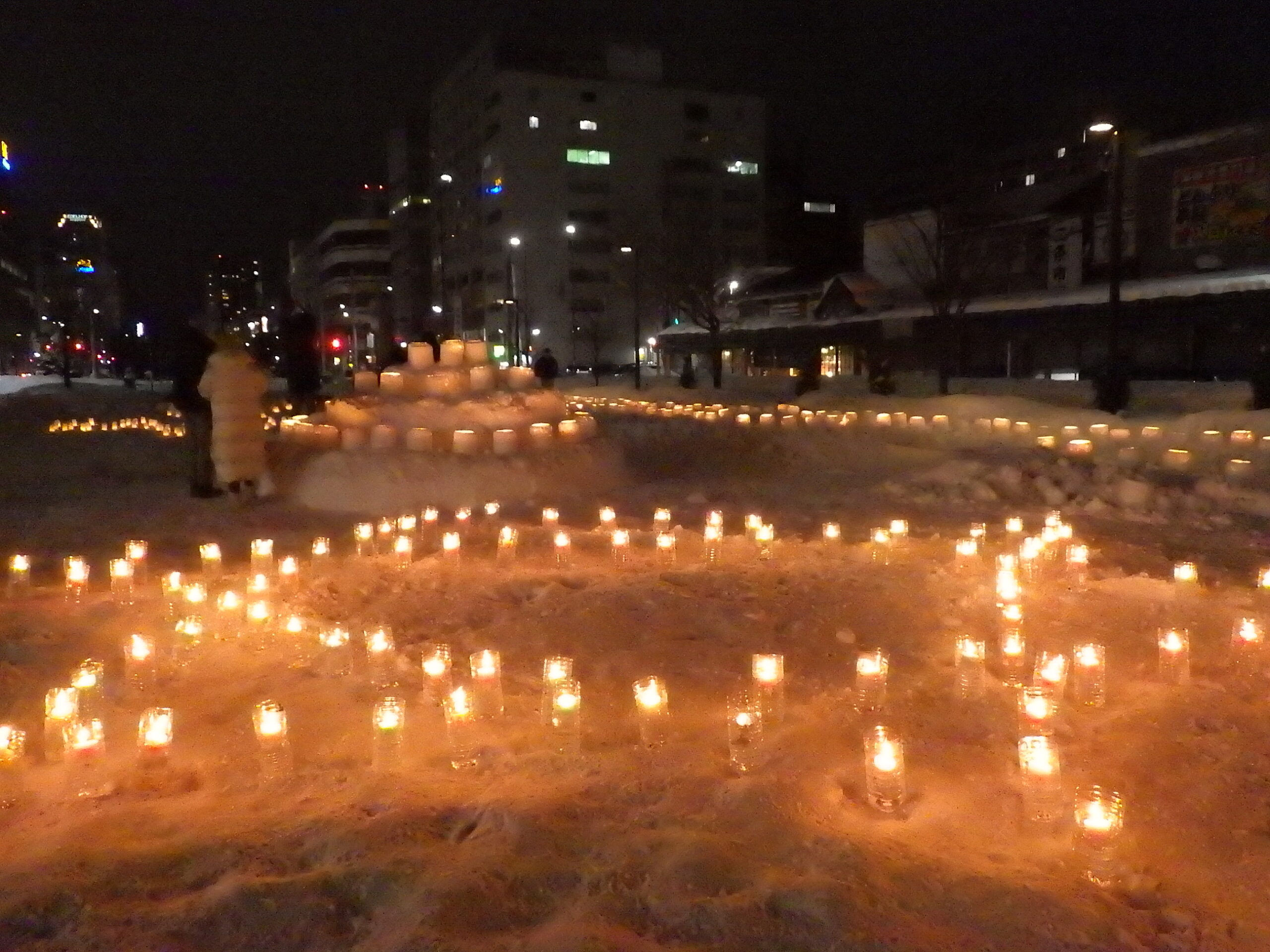 1月20日の創成川公園まちの灯りで、灯りがともった狸二条広場の様子