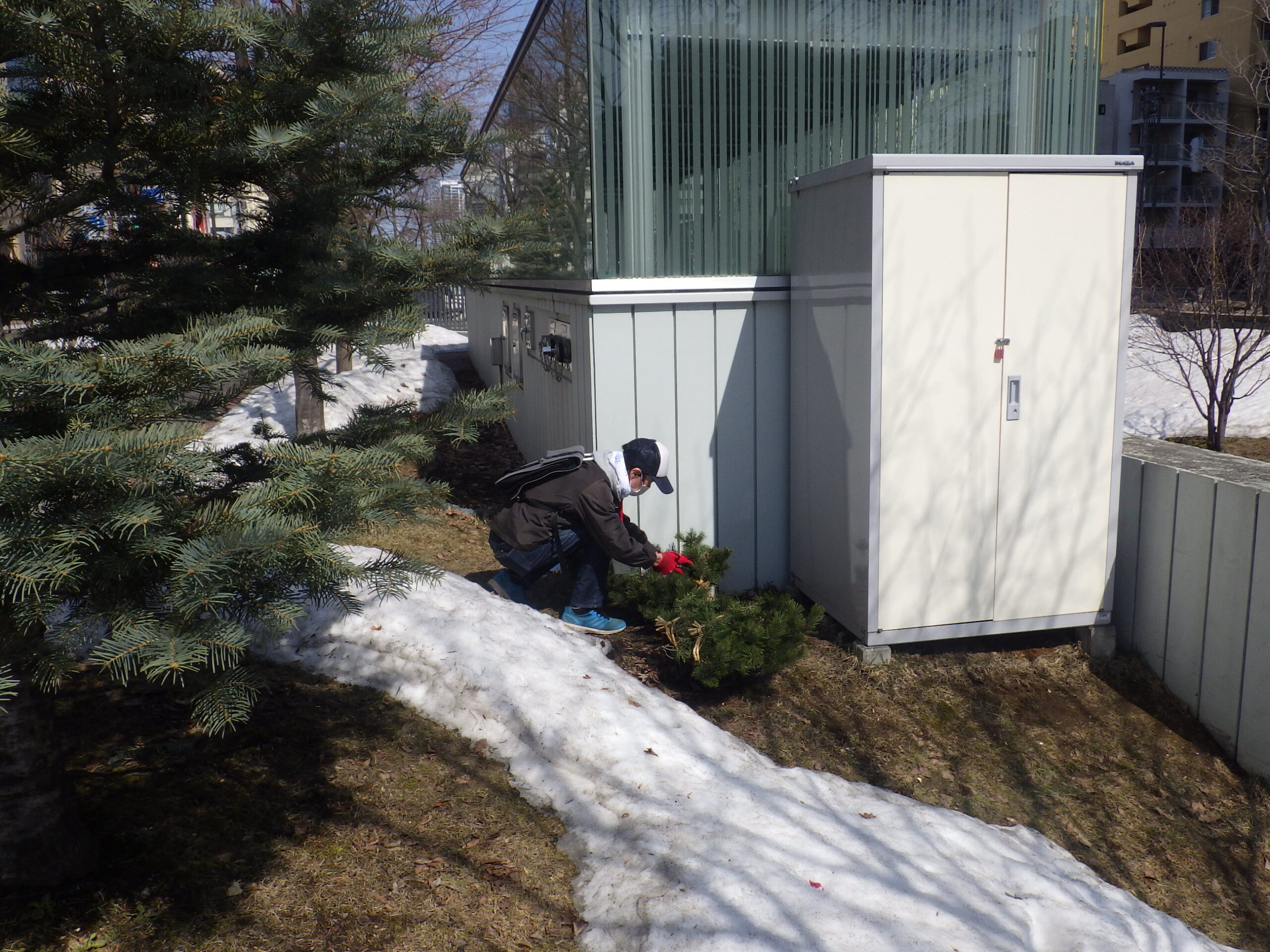 4月3日にモンタナマツの冬囲い外しの作業をするお助け隊