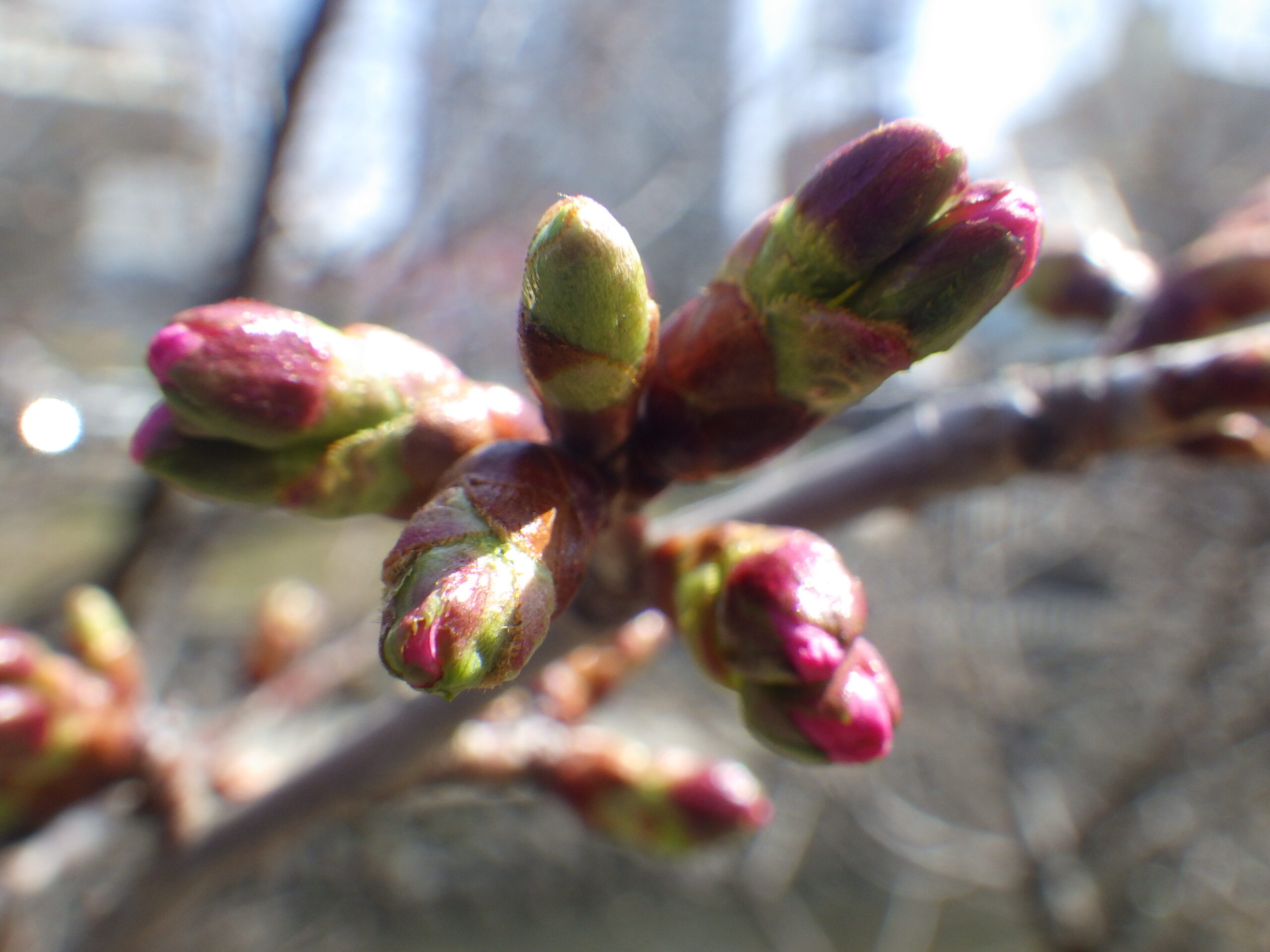 4月14日のチシマザクラのつぼみが膨らんでピンクになっている様子