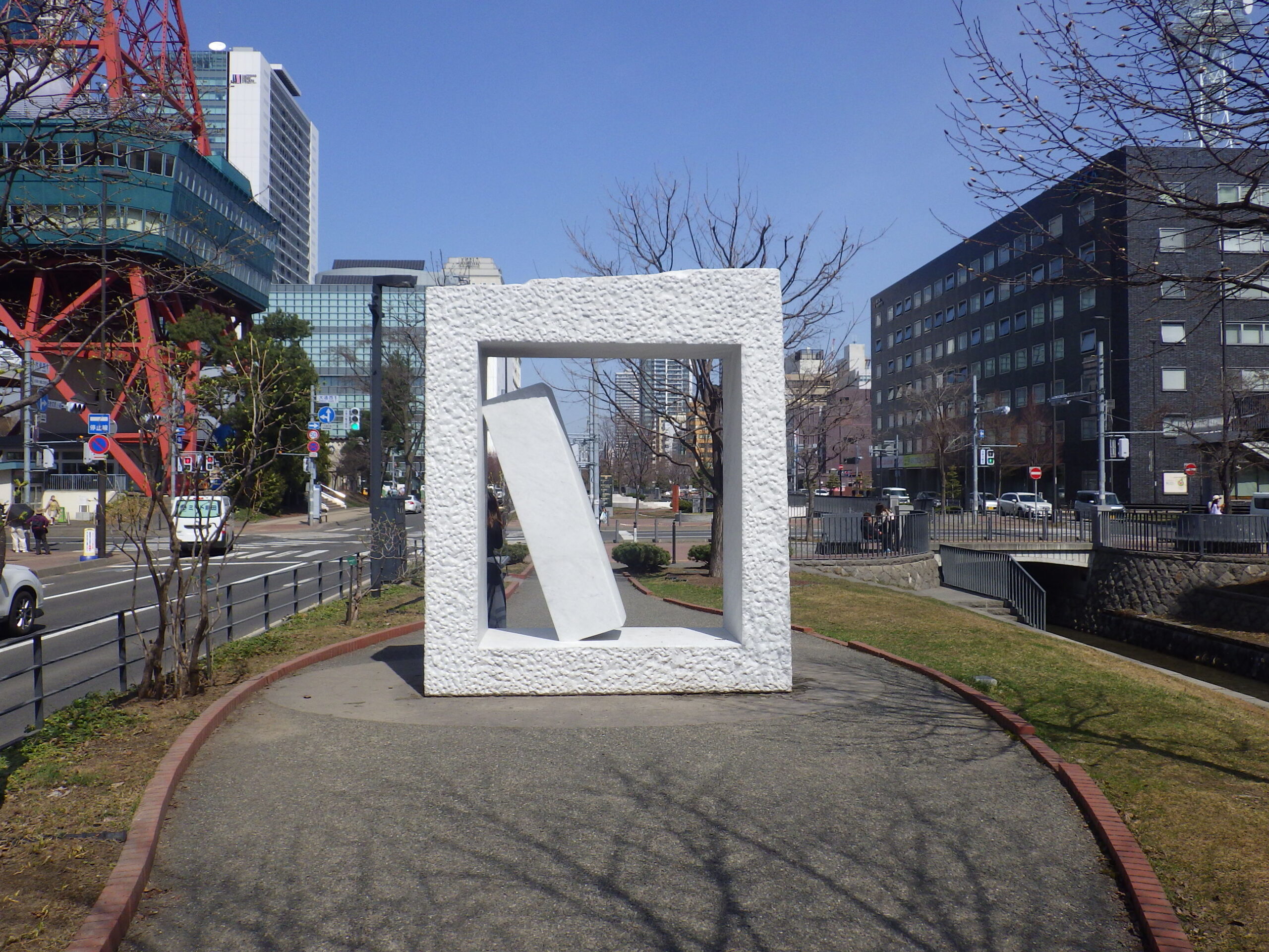 4月15日にシートが外された安田侃さんの彫刻作品「生棒」