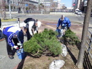 久しぶりの外作業にみんな少しテンションが上がり、頑張って北からモンタナマツとライラックの冬囲い外しを行いました。