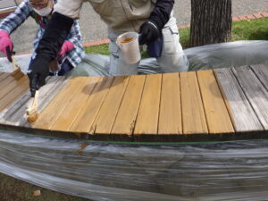 9月28日水曜日、お助け隊の活動で、北1条北2条の円形木製ベンチの塗装を行いました。 南側のベンチと同じ、札幌景観色の「ビア茶」の塗料でベンチを塗っていきました。 こんなにきれいになりました。 少しの間、ベンチは使用できません。 ご迷惑をお掛けしますが、よろしくお願いいたします。