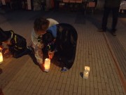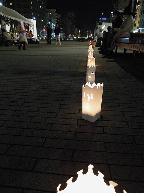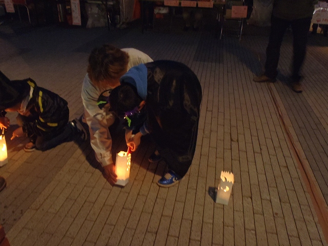暗くなる頃に合わせて、かぼちゃのランタンや牛乳パックで作ったランタンにロウソクのあかりを灯しました。