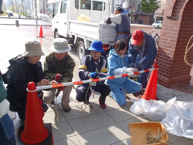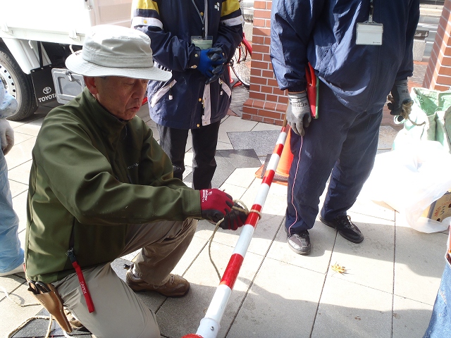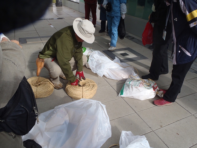 ハギは刈り取って、縄で縛るので、まずは「男結び」の基本から学びました。
