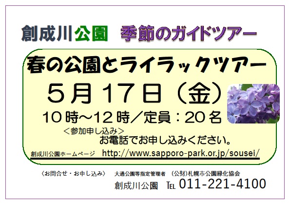 5月17日金曜日に開催する「創成川公園ライラックガイドツアー」の参加者を募集しています。