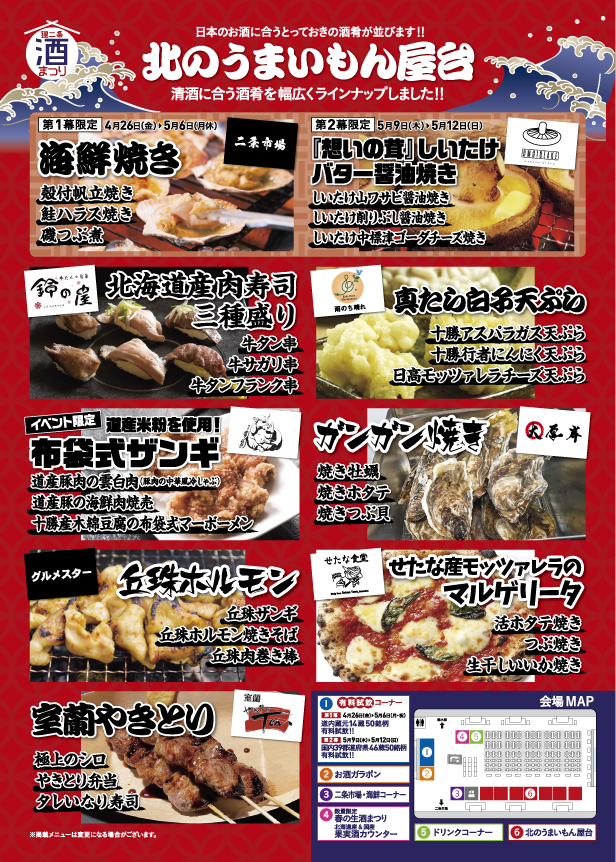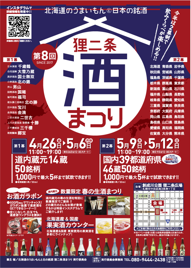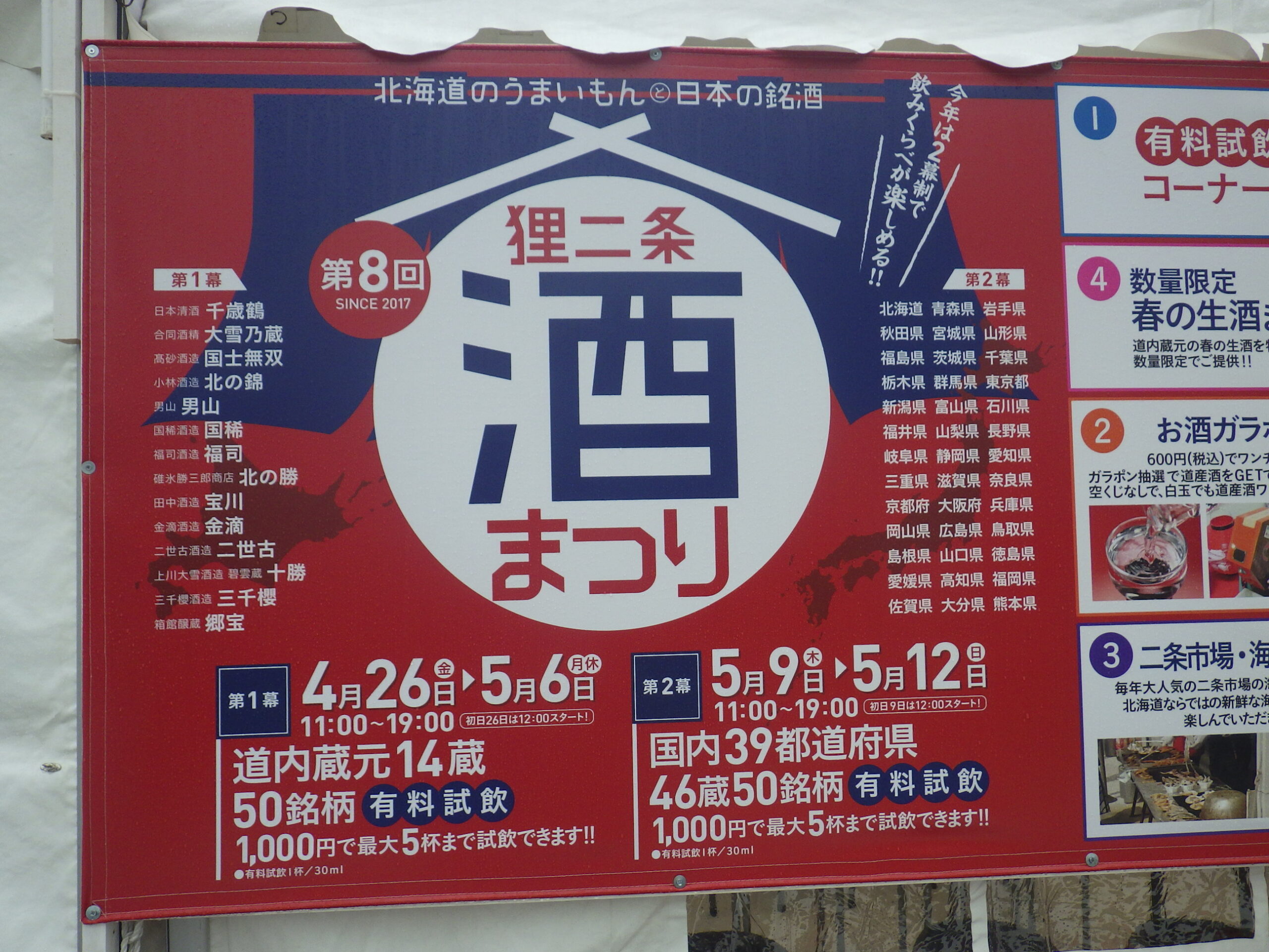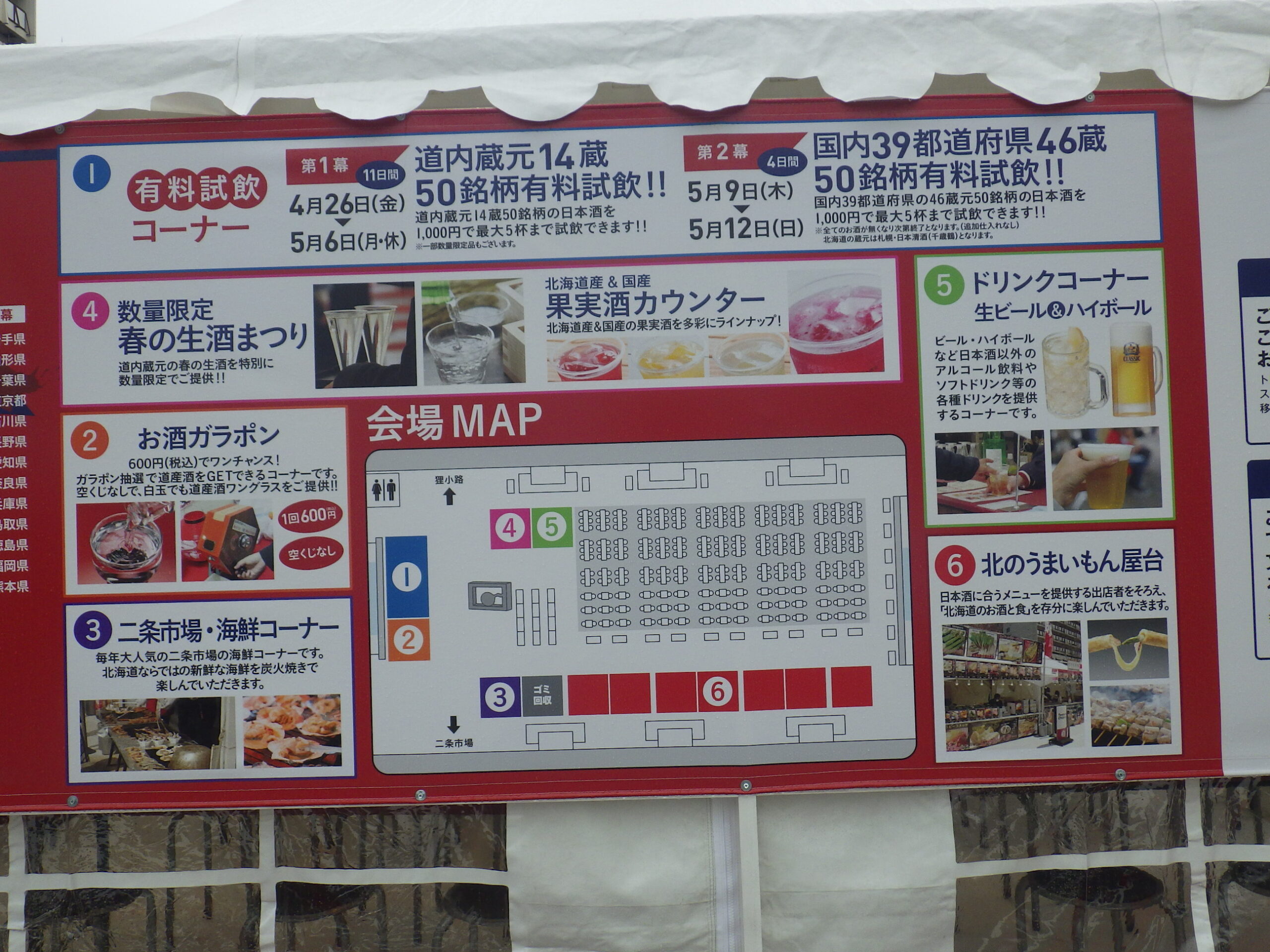 今年は、第1期として4月26日金曜日から5月6日月曜日まで道内の蔵元14蔵の50銘柄を、第2期として5月9日木曜日から5月12日日曜日まで国内39都道府県の46蔵50銘柄を、有料試飲で楽しむことができます。