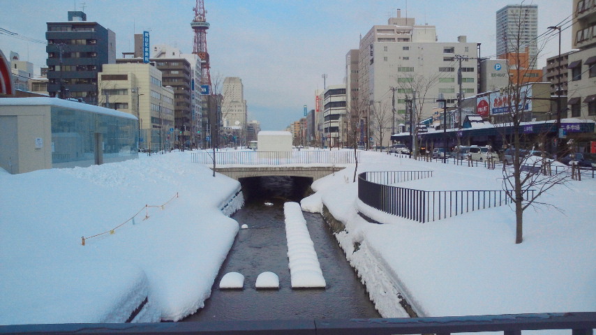 創成川公園も、雪に覆われて、一面真っ白になっています。