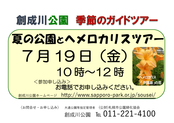ヘメロカリスの咲く、7月19日金曜日に、「夏の公園とヘメロカリスツアー」を開催します。