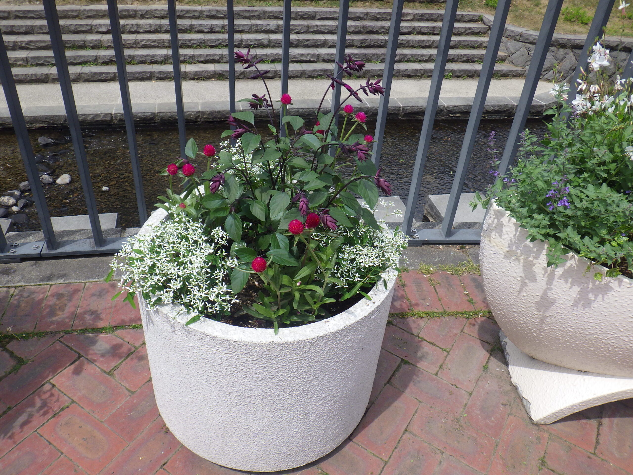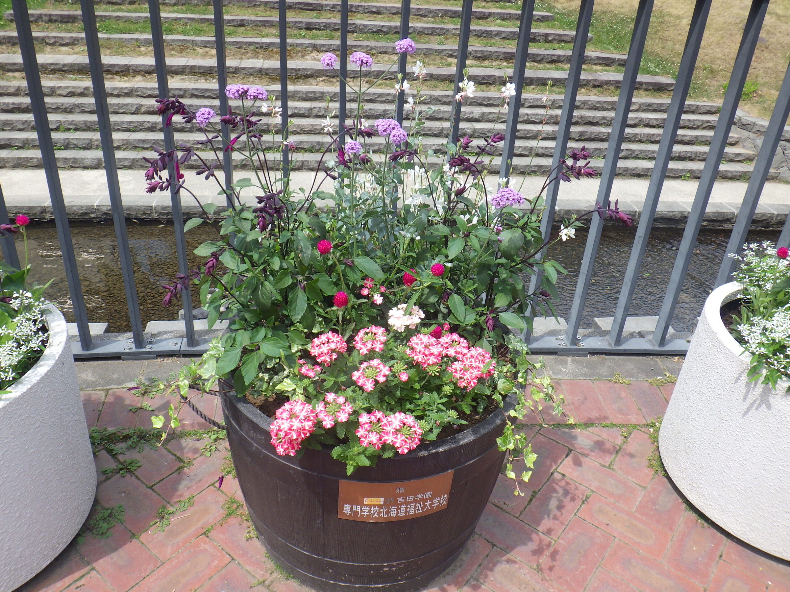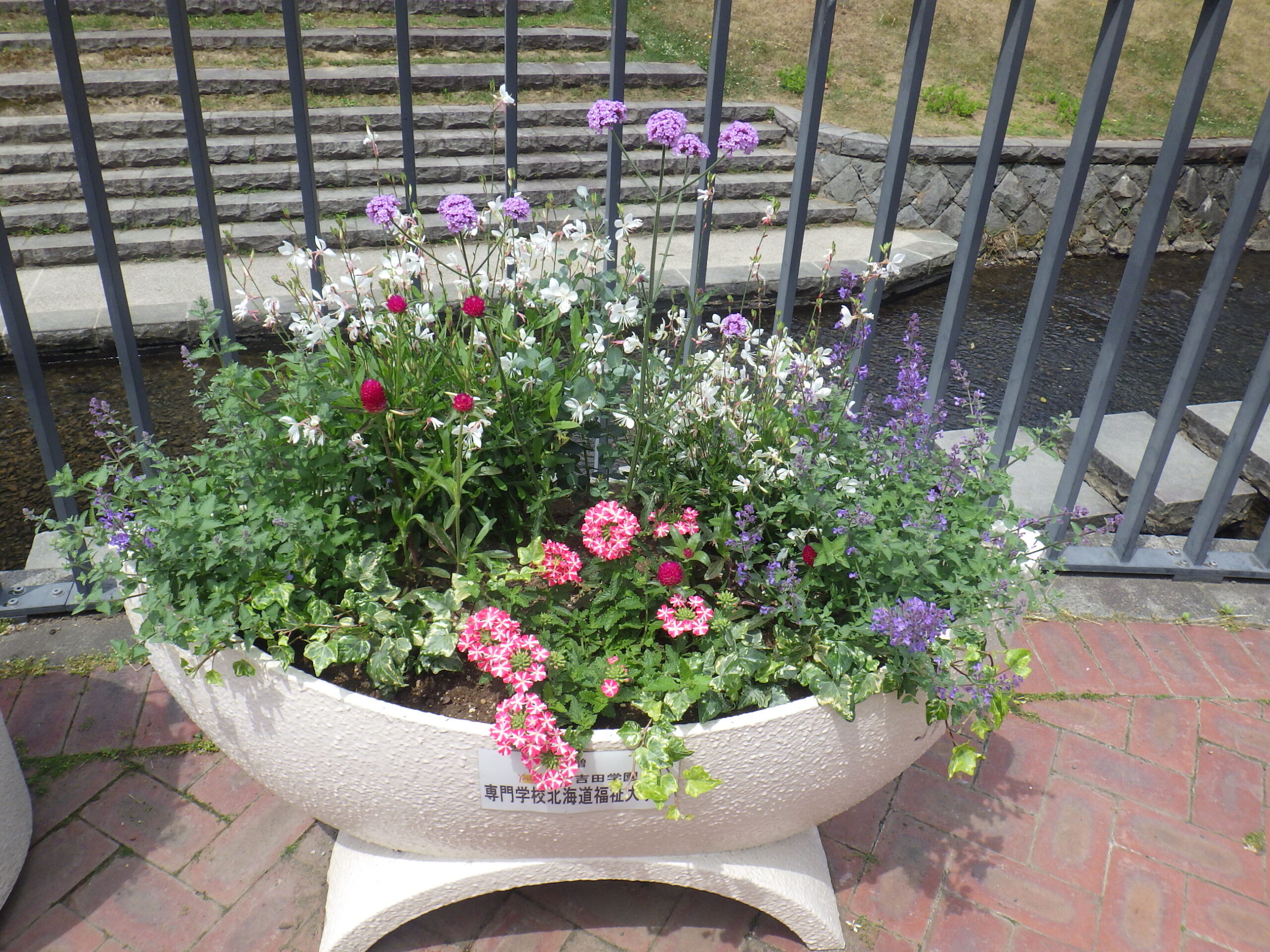 狸二条広場吉田学園さん寄付のコンテナ花壇の花はどんどん咲いてきています。色合いが夏らしいですね。