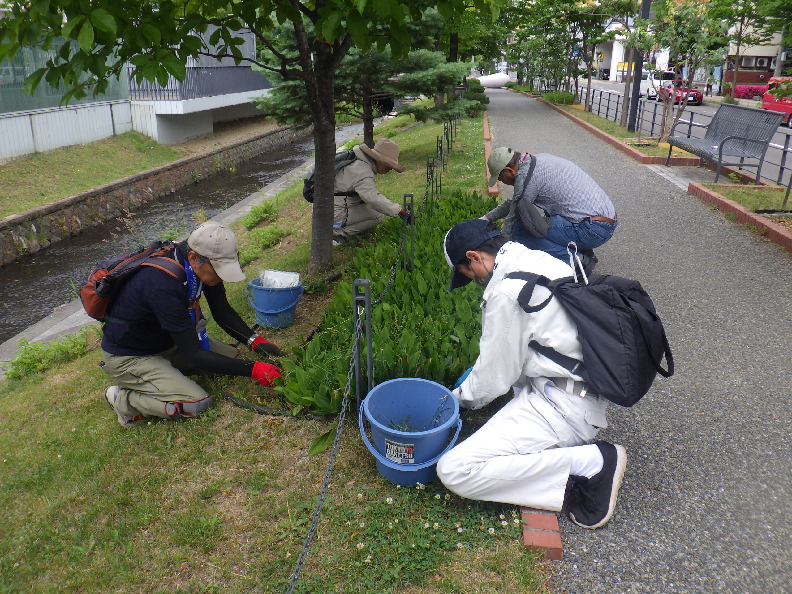 お助け隊では、花の終わったスズランの花名板を外してから、スズラン花壇の除草です。
