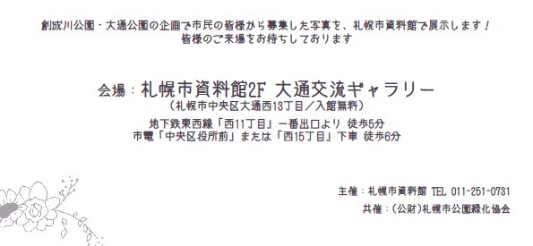 7月17日水曜日から、札幌市資料館2階「大通交流ギャラリー」にて、皆さんが投稿してくれたライラックの写真を展示する「創成川公園ライラック写真展」を開催します。