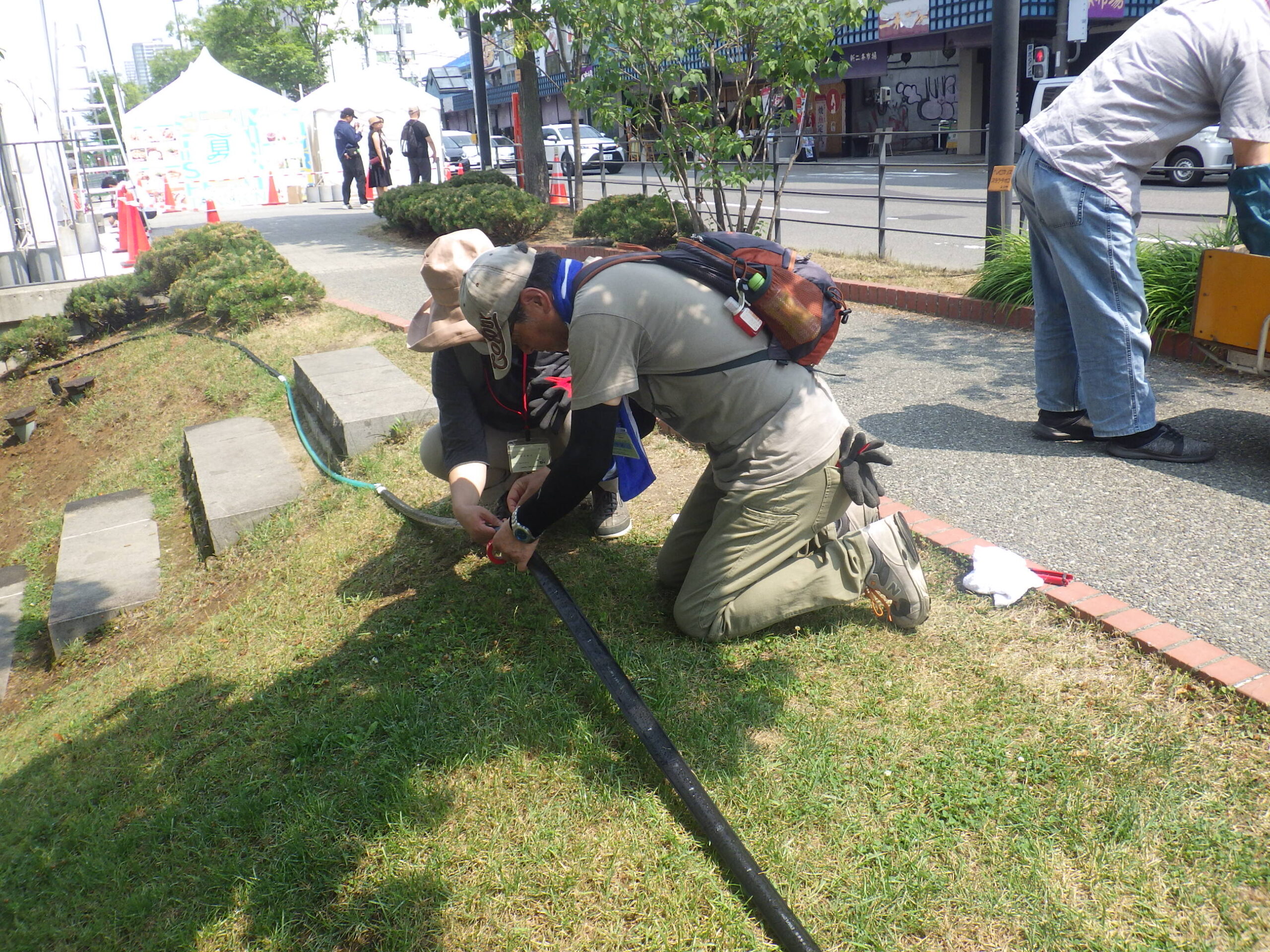 お助け隊の皆さんには、まず、公園内の灌水ホース設置作業のお手伝いをしていただきました。