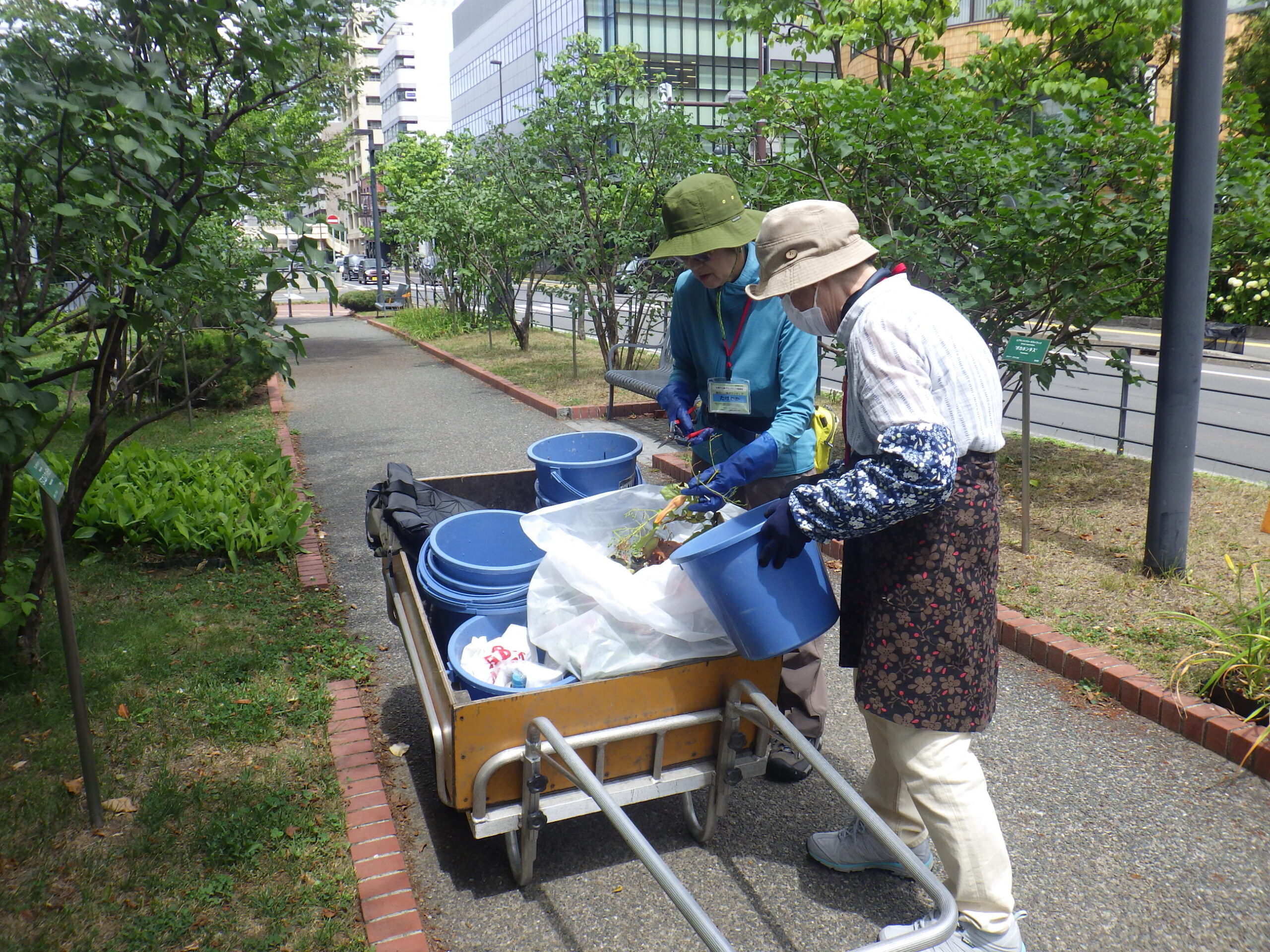 除草ボランティアの皆さんは、ヘメロカリス花壇の横で雑草取りの作業です。