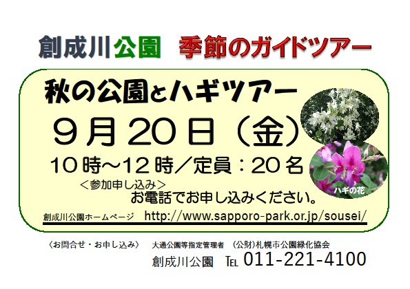 9月20日金曜日に、公園スタッフと創成川公園を巡る「秋の公園とハギツアー」を開催します。 ただいま参加者募集中! 時間は10時から12時、5分前までに狸二条広場「生誕」前に集合です。 お申し込みは、管理事務所までお電話で。(電話011-221-4100) ハギの花を見ながら、のんびりと、公園内を散歩しませんか。 昨年のハギの様子です。 みなさまのご参加をお待ちしております。