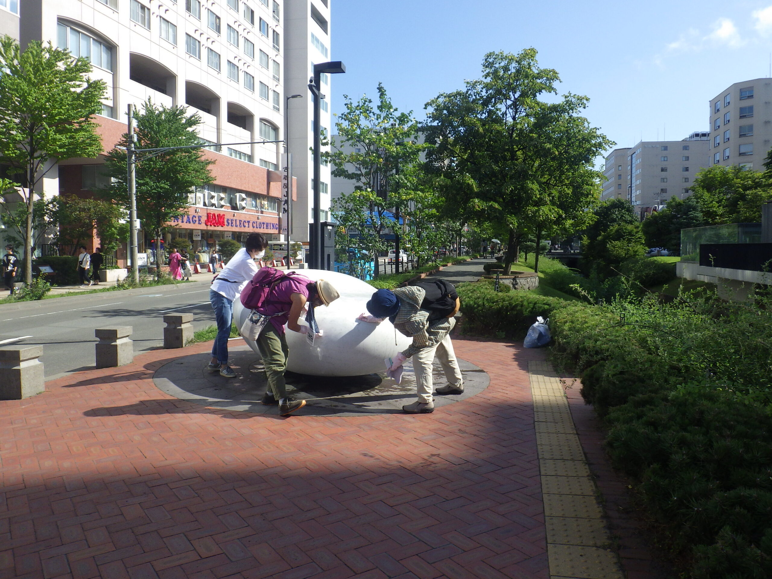 8月24日土曜日、月に1度の活動日の彫刻清掃ボランティア「創成川ポポロ」のみなさん。