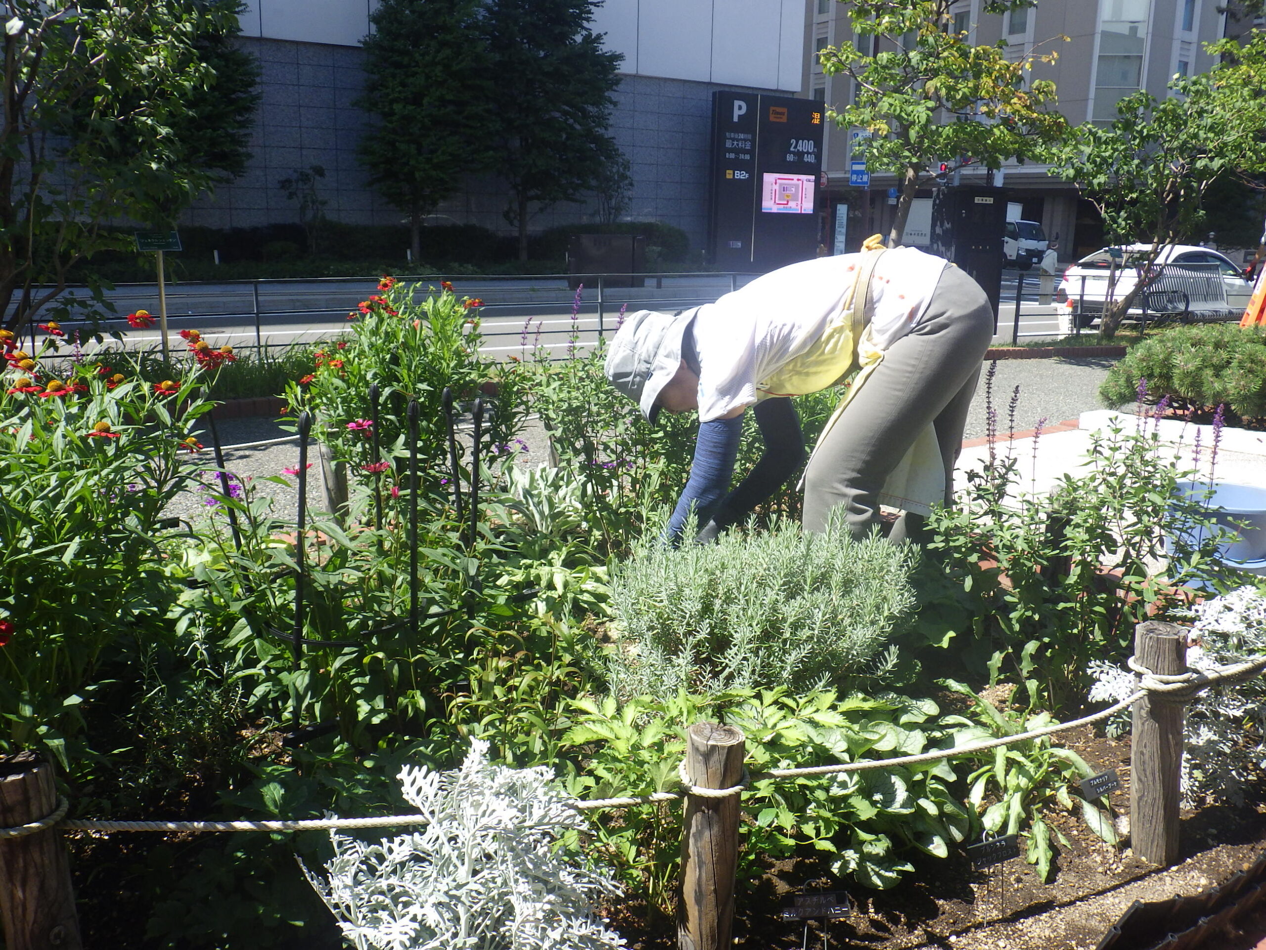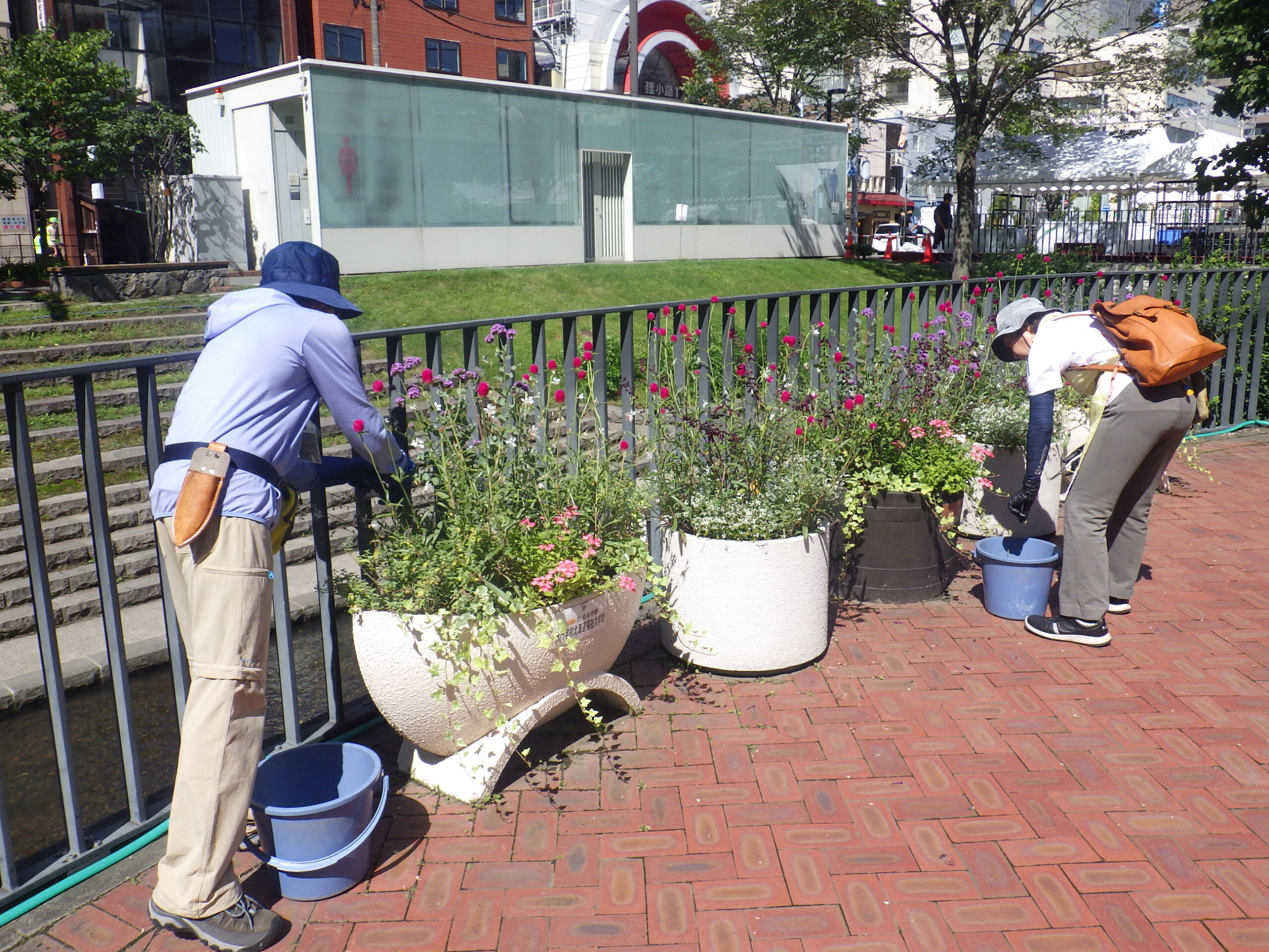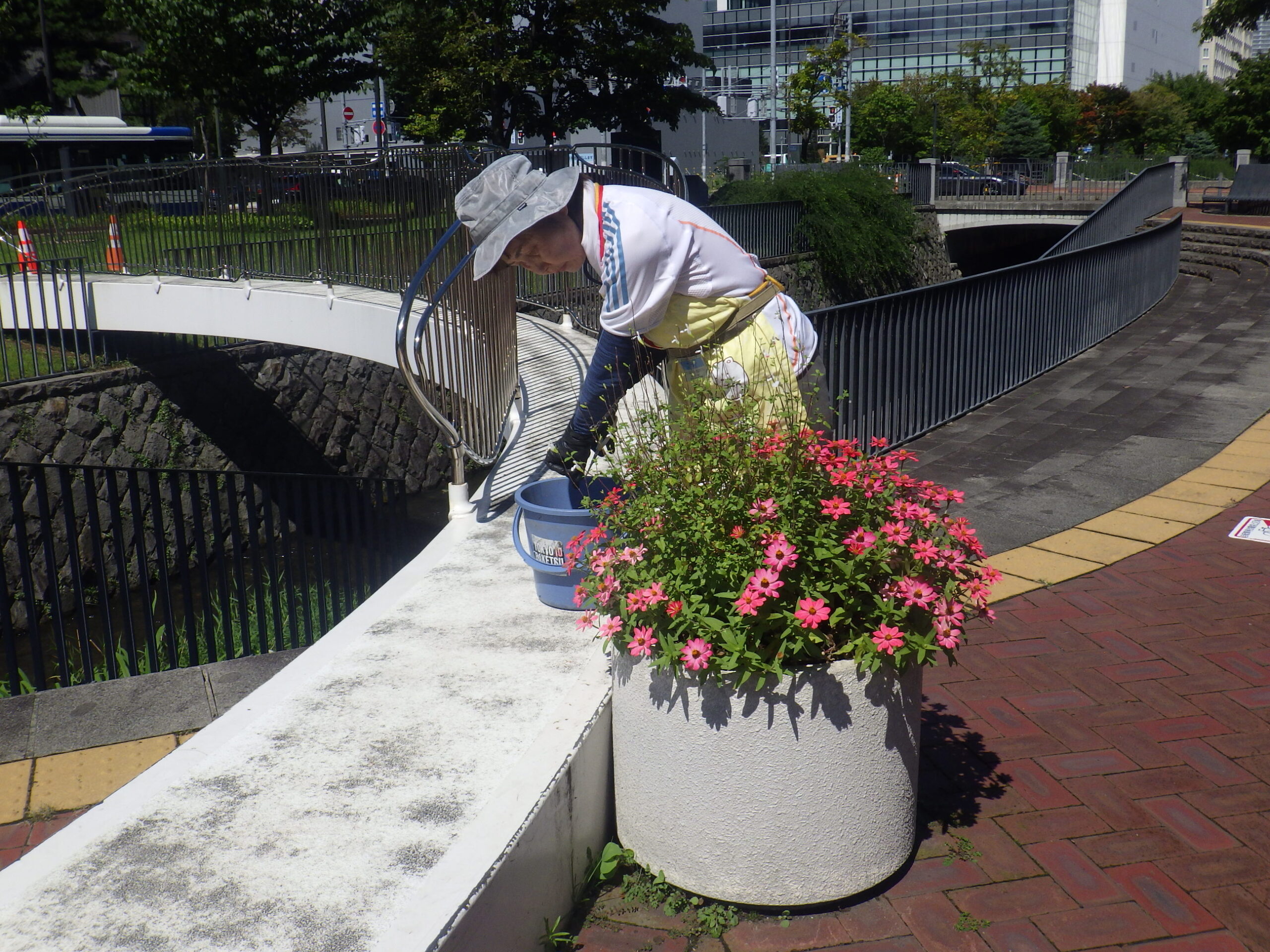 8月29日木曜日、花くらぶでは、まず狸二条広場のコンテナ花壇のお手入れ。