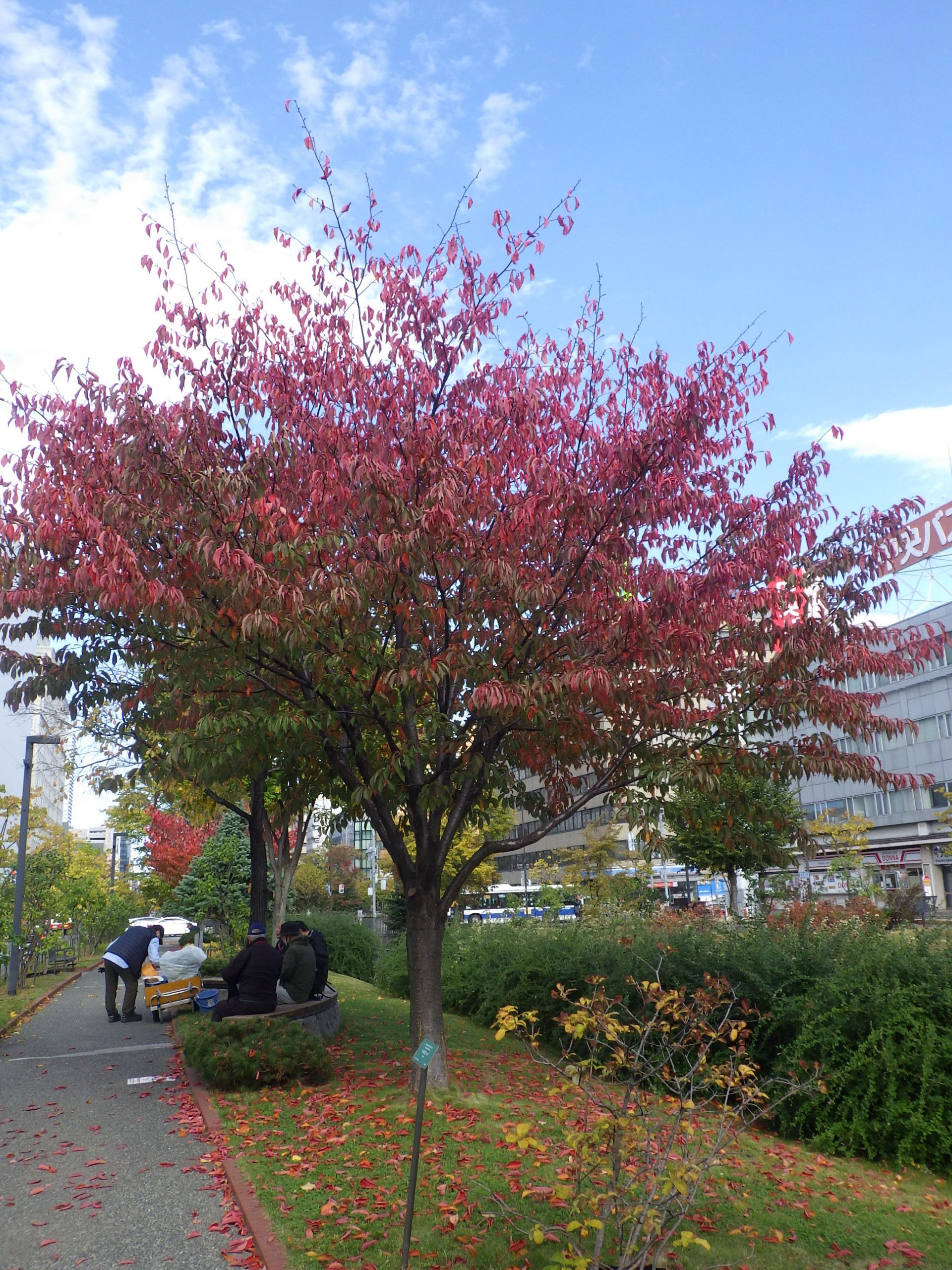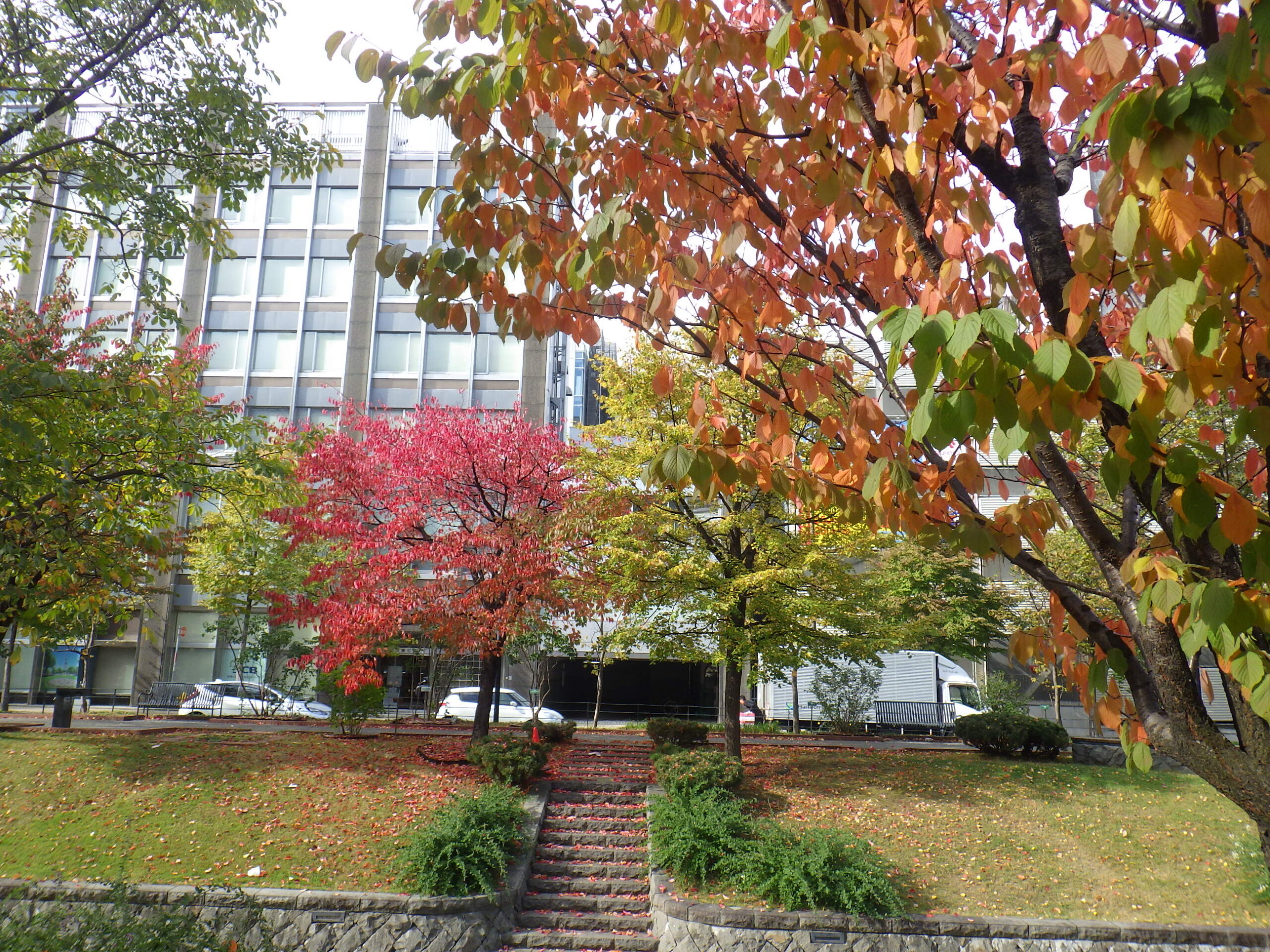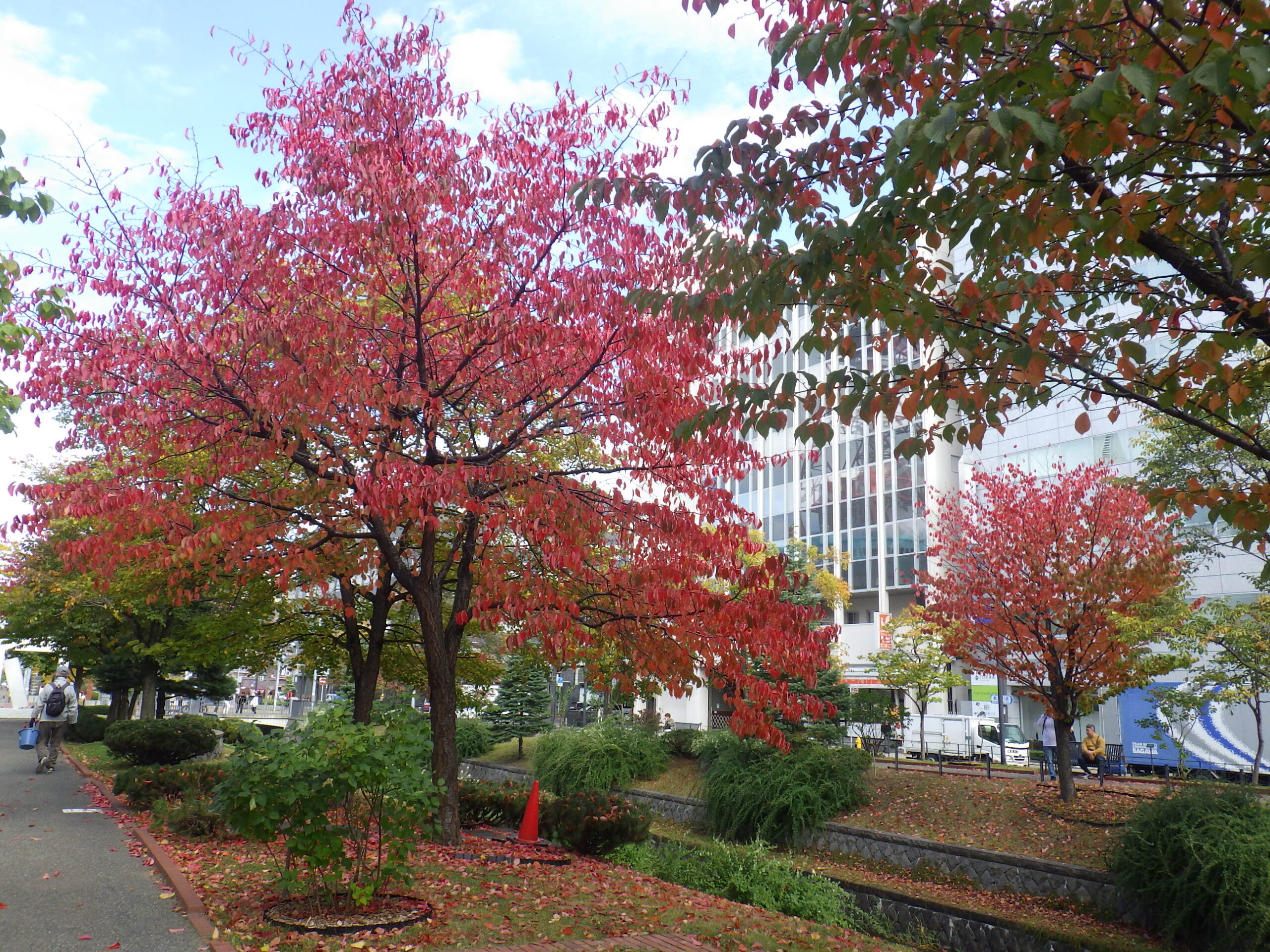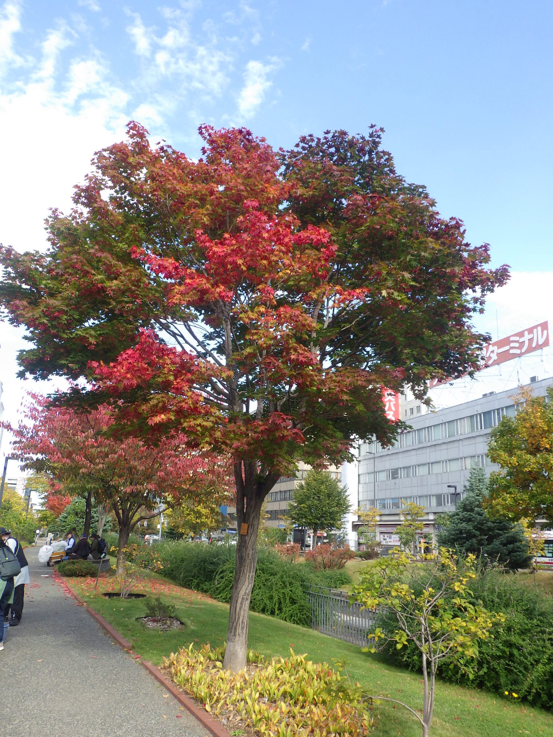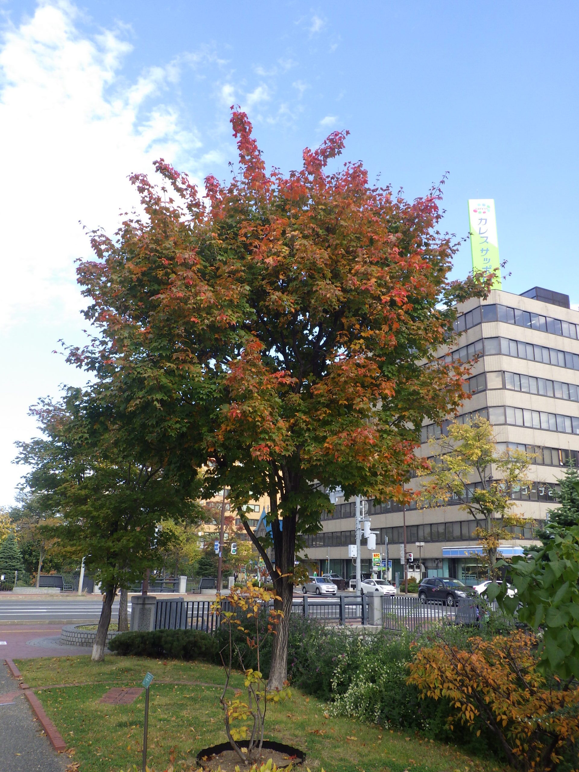 朝晩の寒さも増してきたこのところ、公園内の紅葉も進んでいます。 南1条東側の真っ赤に色づいたエゾヤマザクラ、隣で黄色く色づいているのはシナノキです。 こちらは北1条のエゾヤマザクラです。 赤い葉が緑の芝生に落ちてきれいな絨毯になります。 ヤマモミジも赤く色づいてきています。 イタヤカエデは黄葉ですね。 これからどんどん紅葉が進んでいきますね。