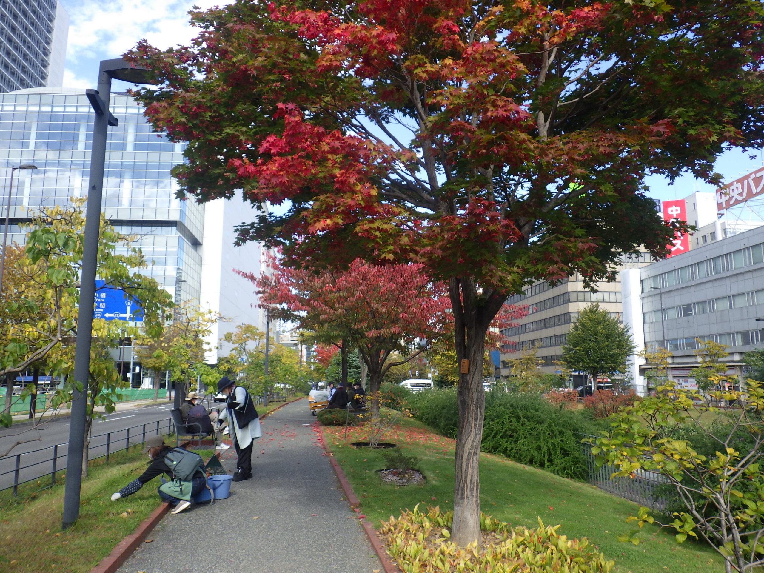 紅葉も進む園内を、40か所以上あるヘメロカリス花壇の刈込みをしながら進んでいきます。