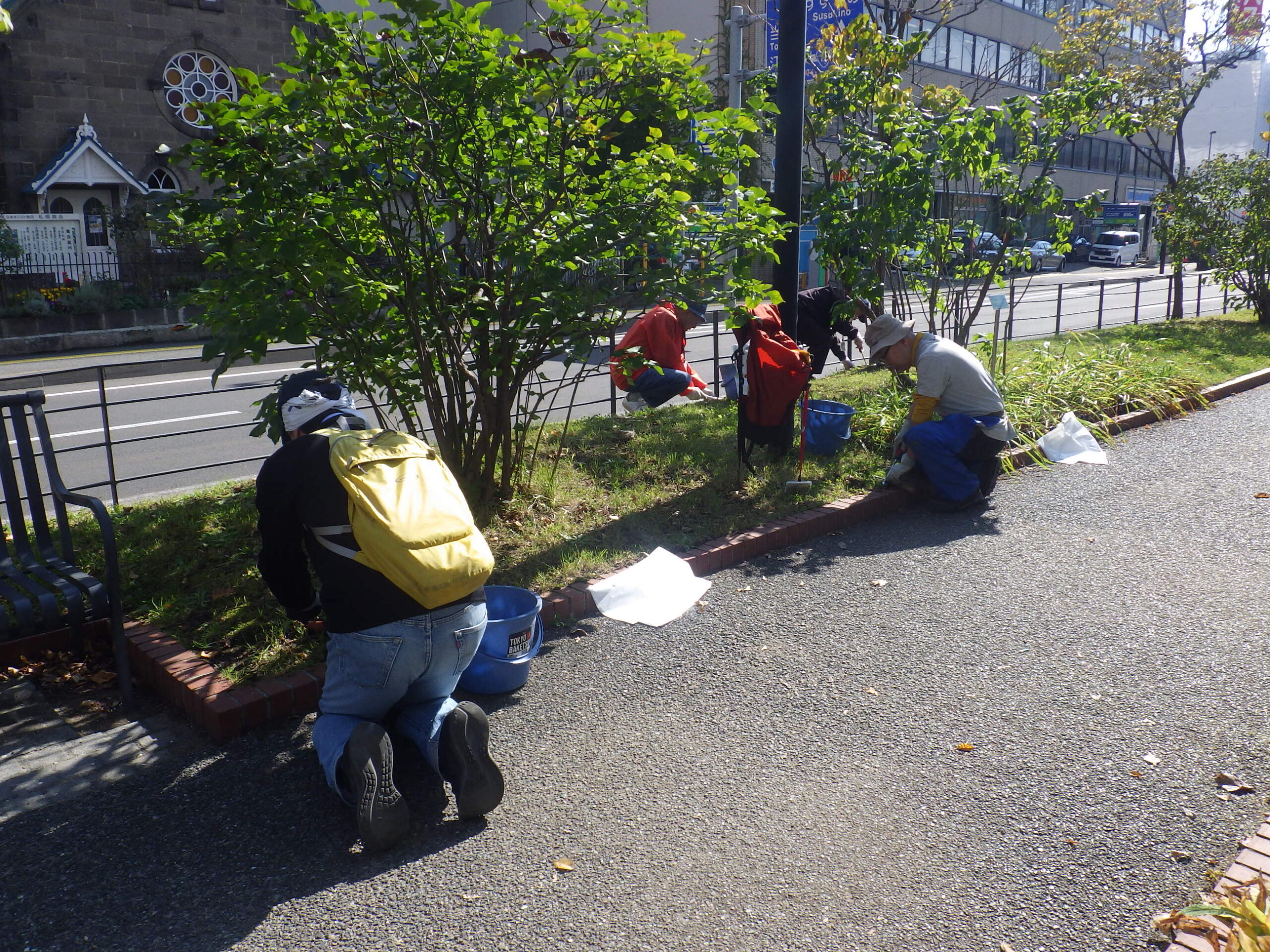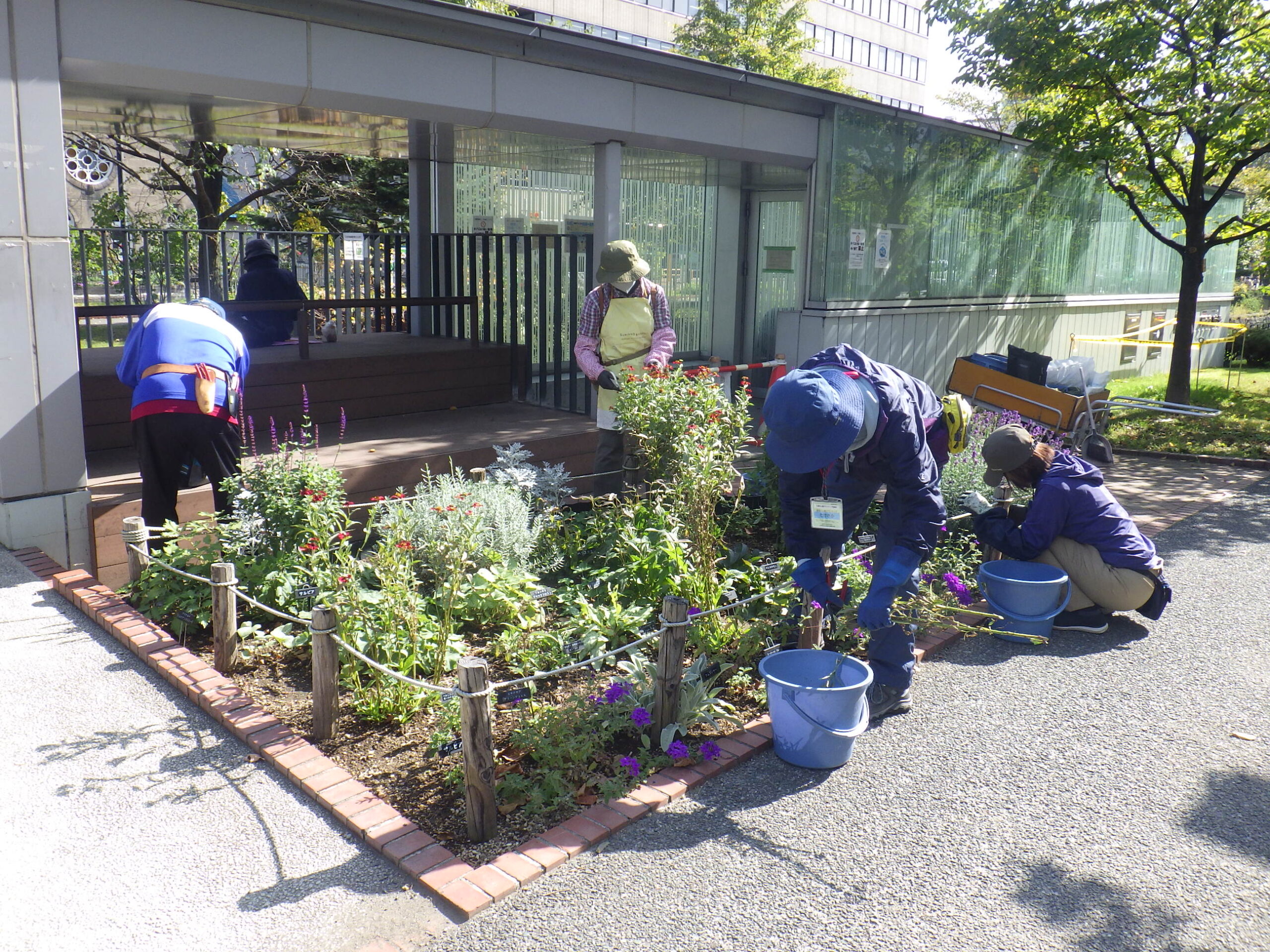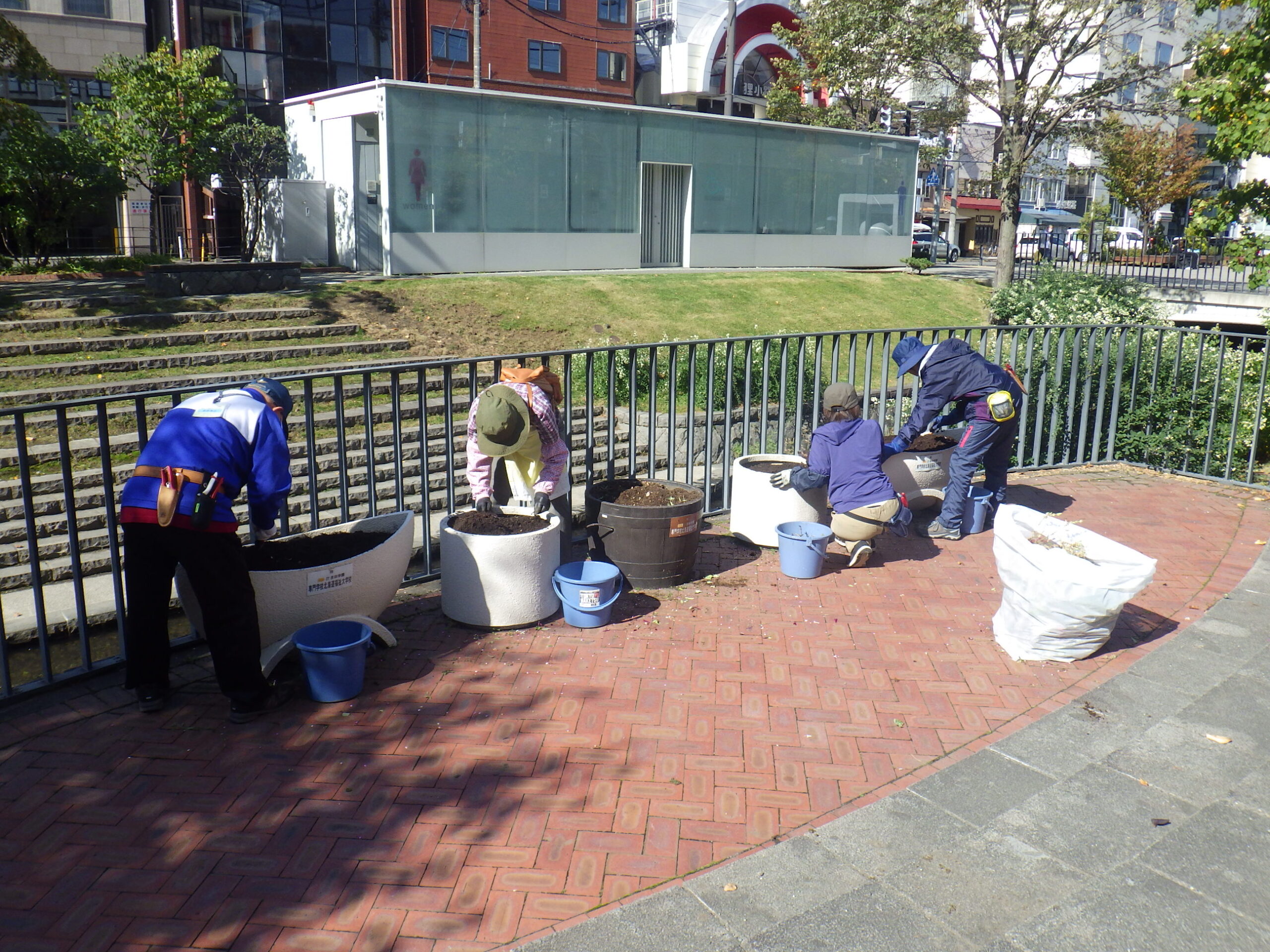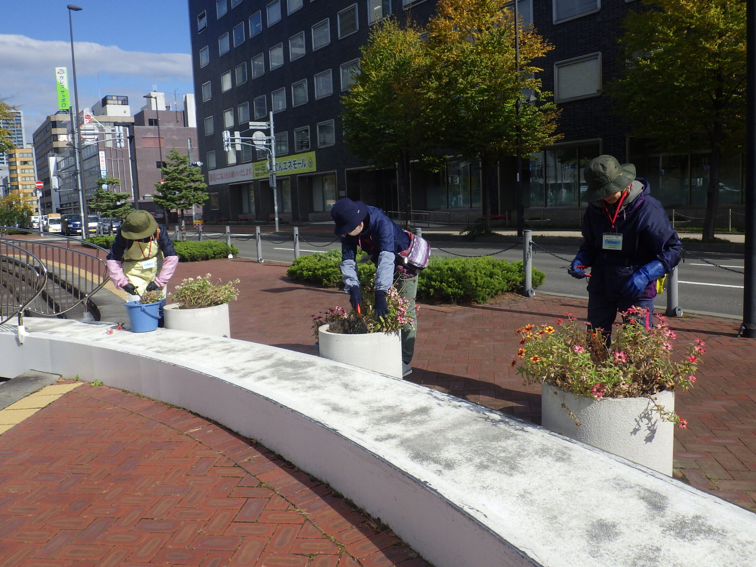 10月10日木曜日、花くらぶでは、狸二条広場トイレ前のコンテナ花壇の花苗抜きをして、根や雑草などをきれいに取り除きます。来年まで、このコンテナ花壇はお休みです。