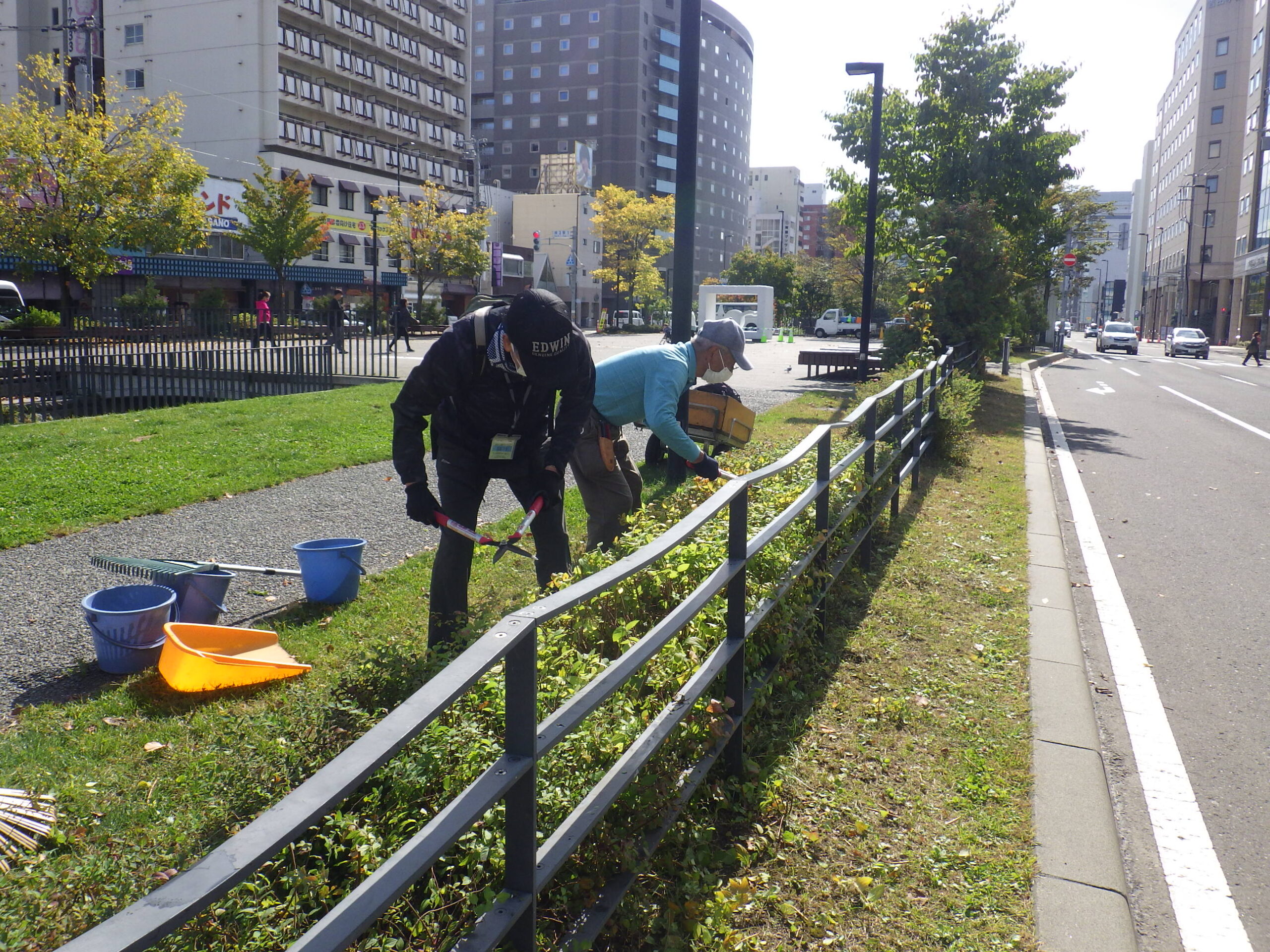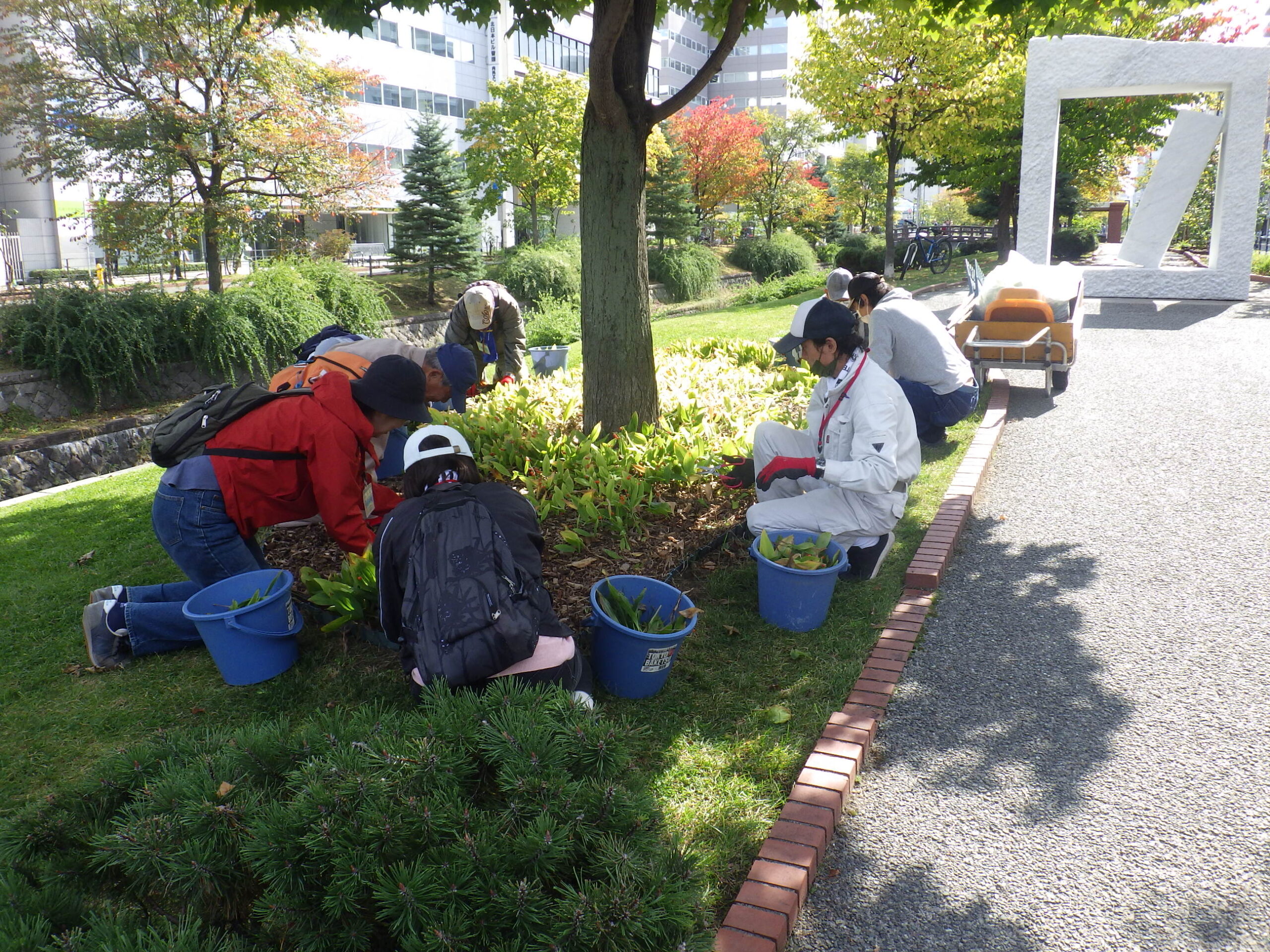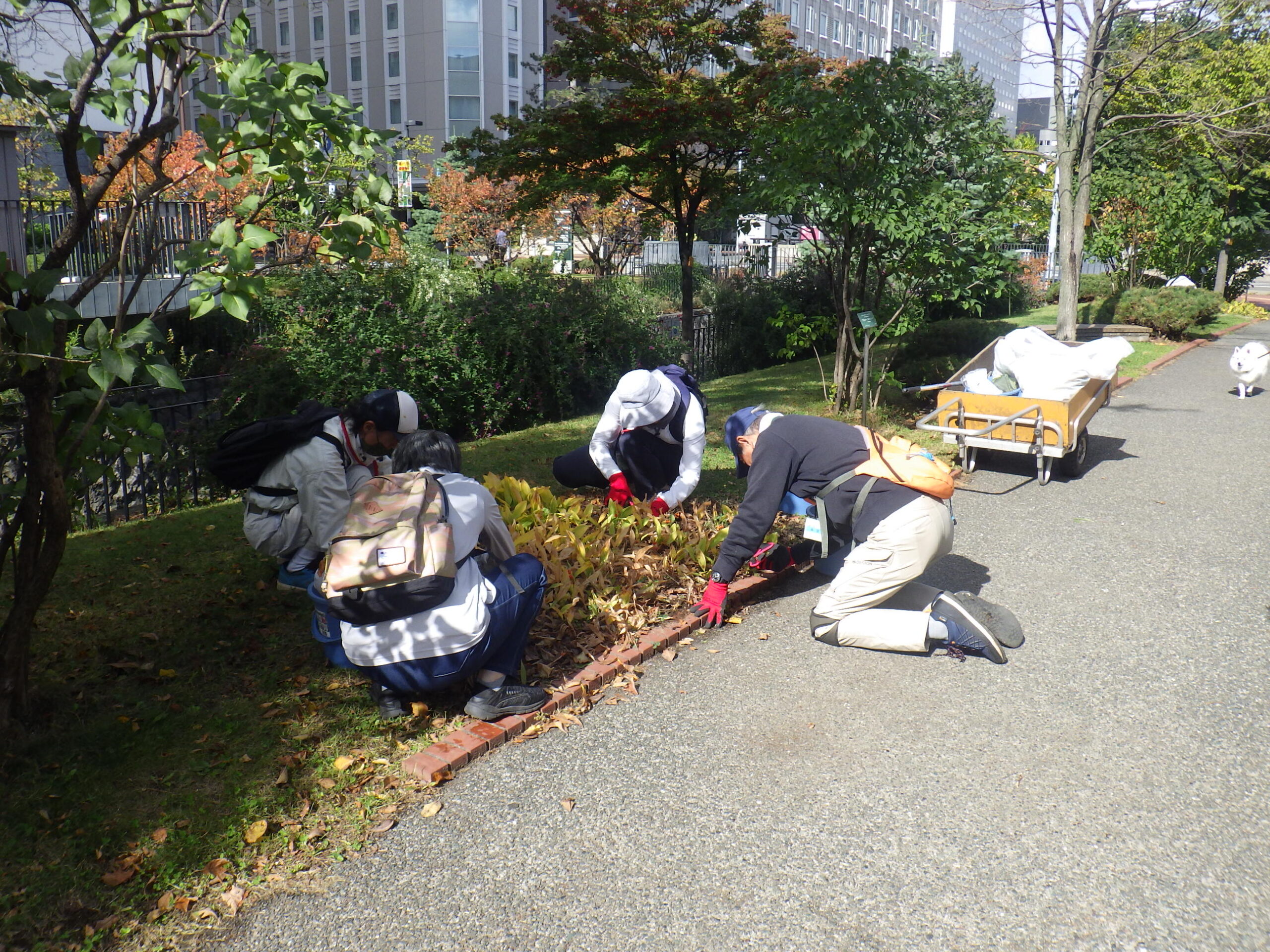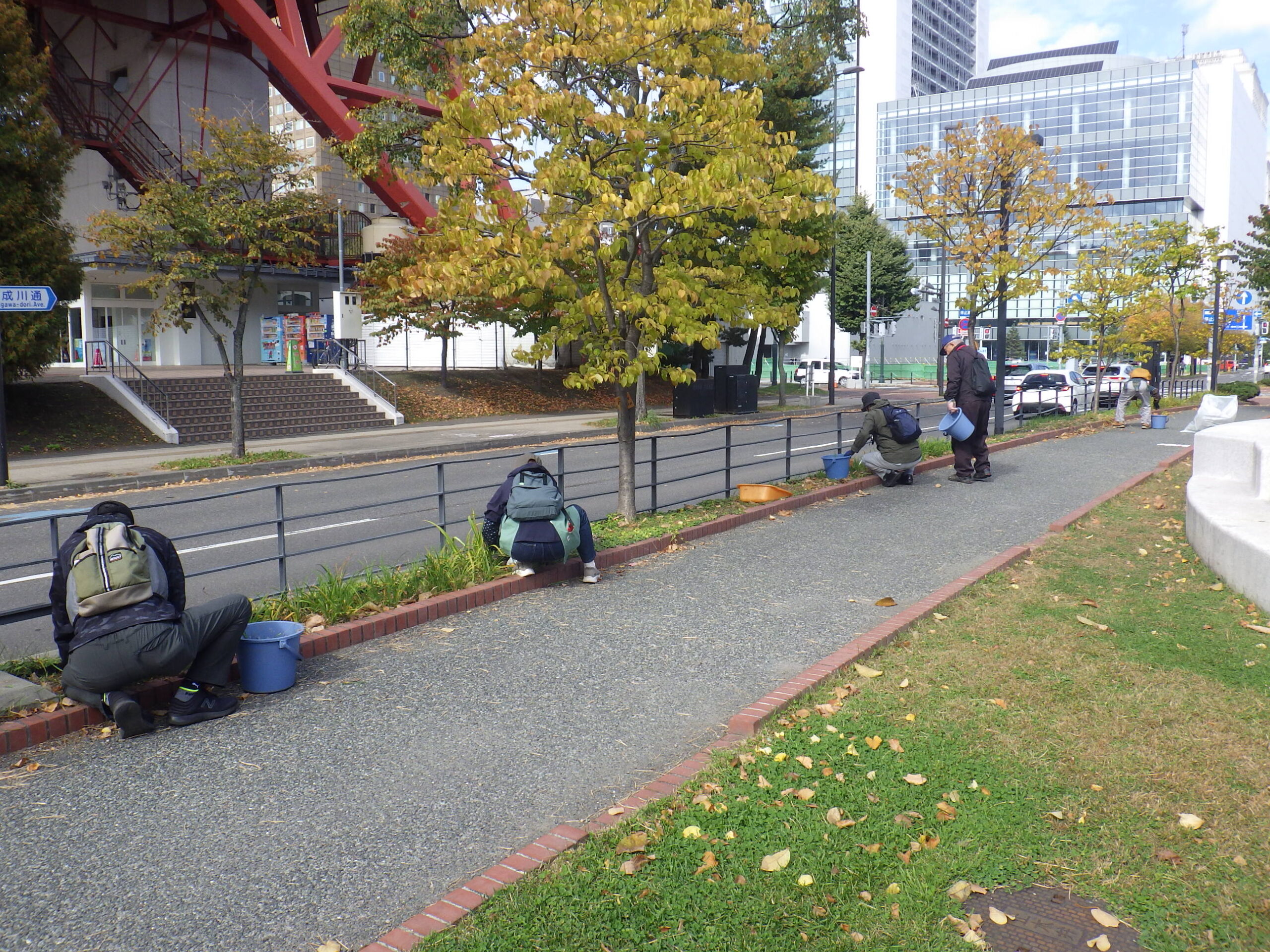 10月10日木曜日、花くらぶでは、狸二条広場トイレ前のコンテナ花壇の花苗抜きをして、根や雑草などをきれいに取り除きます。来年まで、このコンテナ花壇はお休みです。