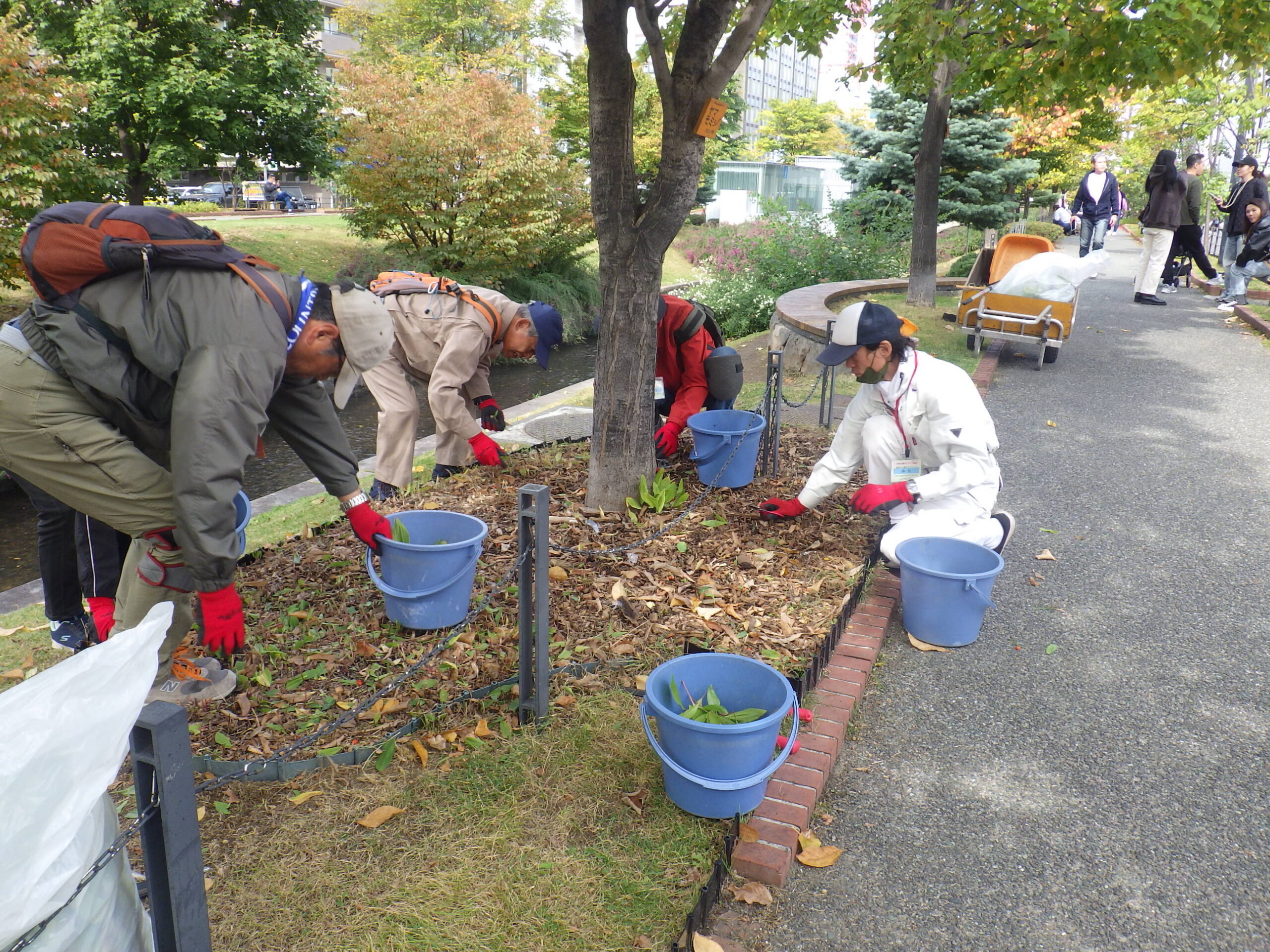 10月17日木曜日、花くらぶでは、今度はまんなか広場のコンテナ花壇の花抜きです。